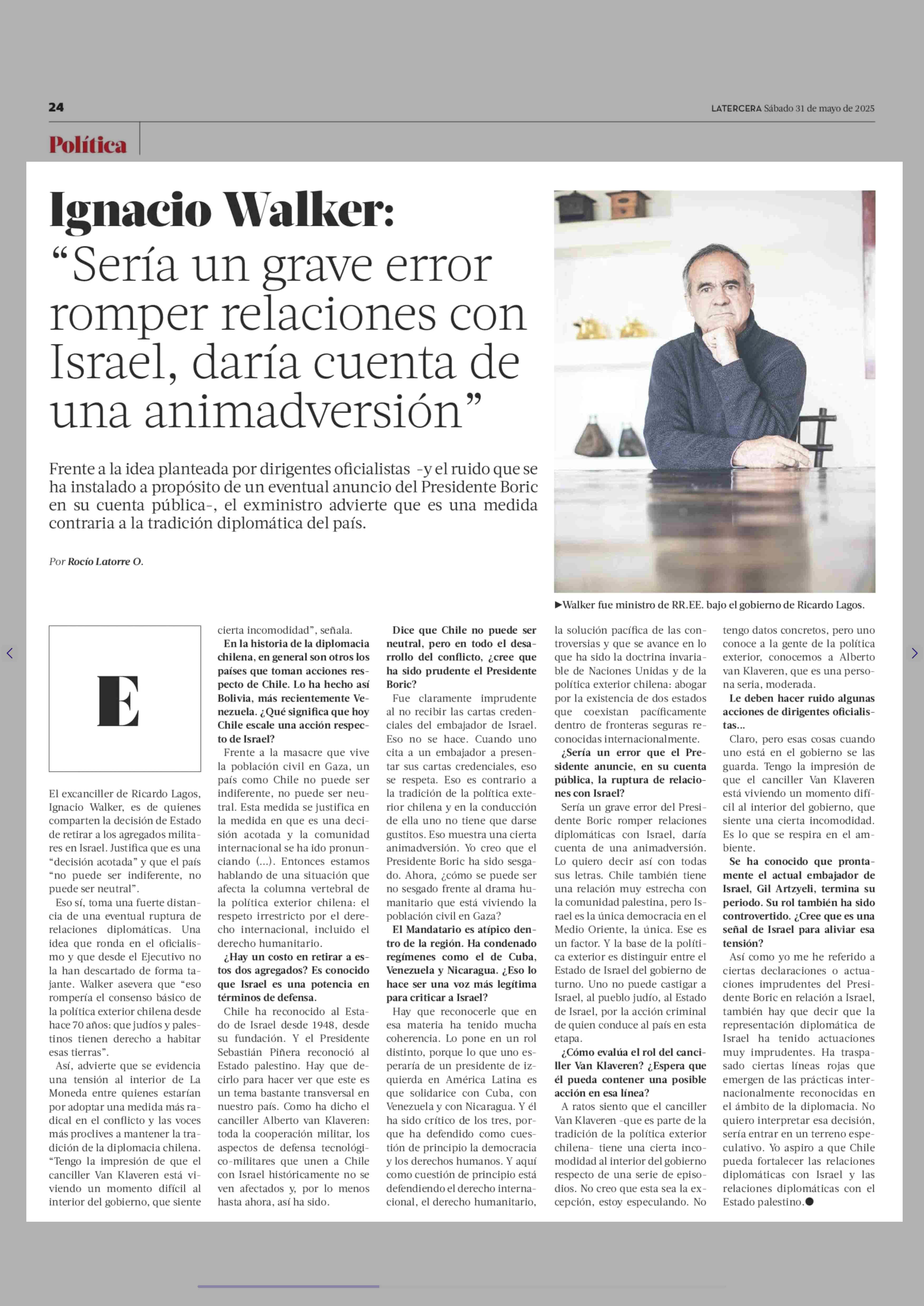 Ignacio Walker: “Sería un grave error romper relaciones con Israel, daría cuenta de una animadversión” 31-05-2025 La Tercera |