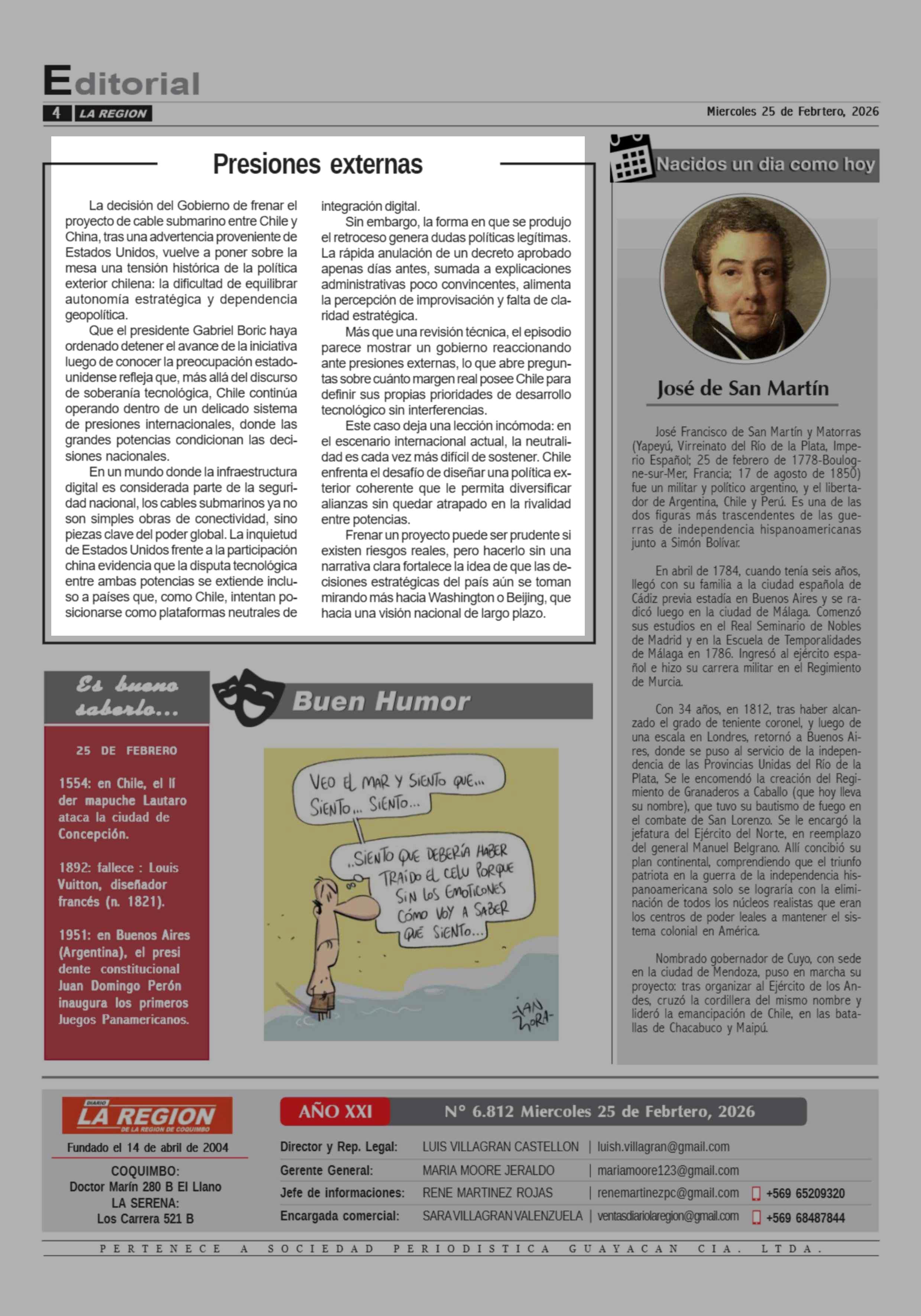 Editorial: Presiones externas 25-02-2026 Diario la Región |
