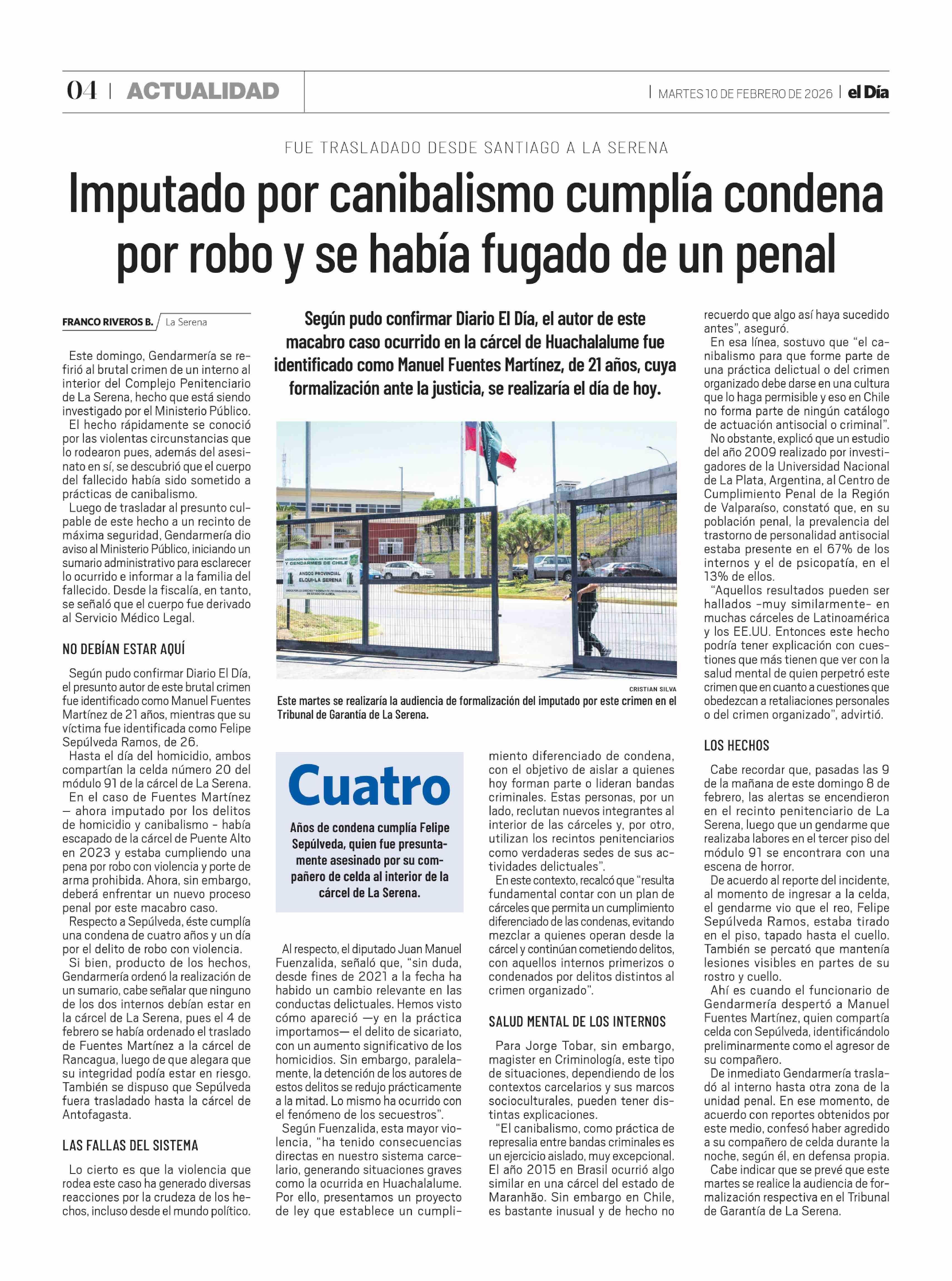 Imputado por canibalismo cumplía condena por robo y se había fugado de un penal 10-02-2026 El Día |