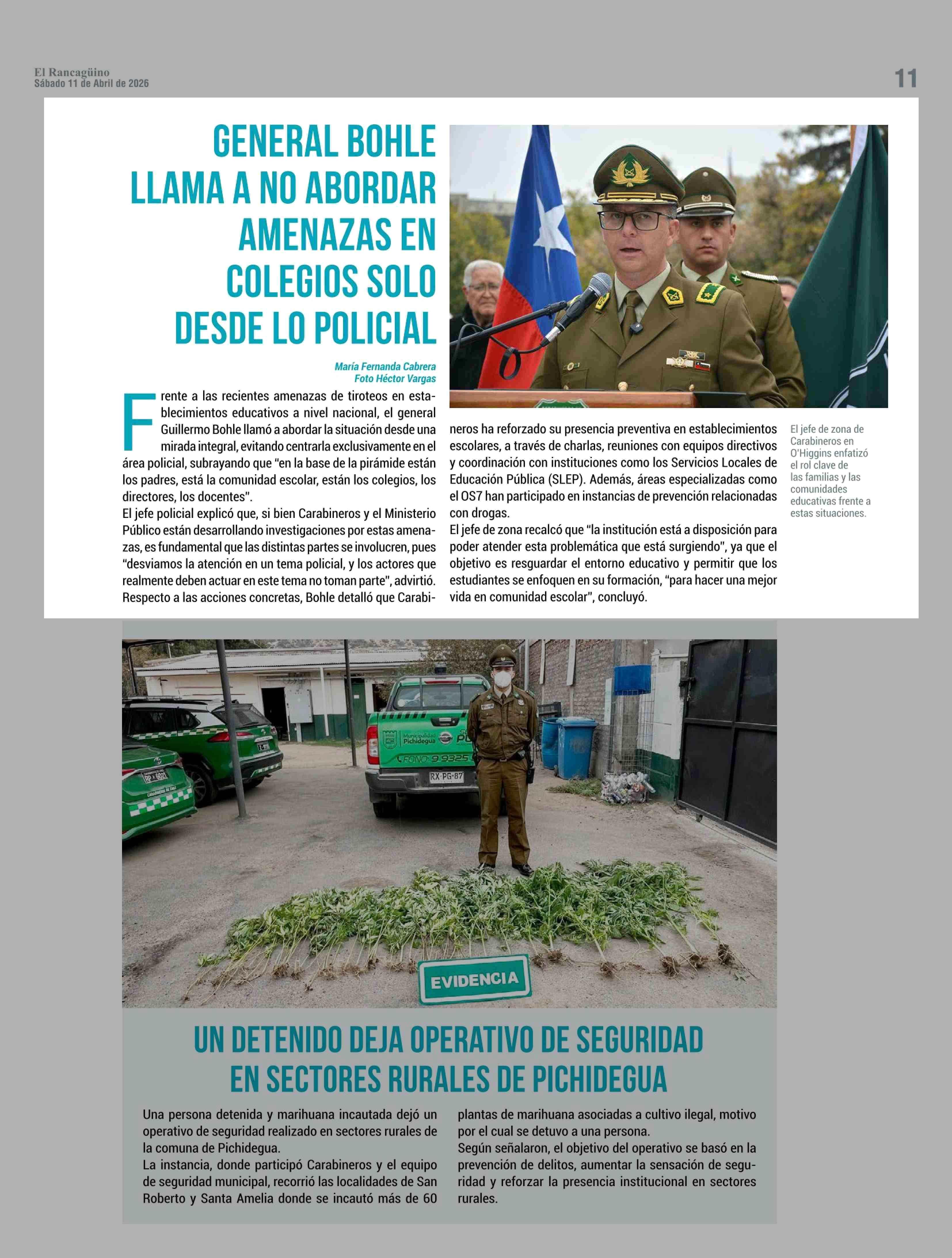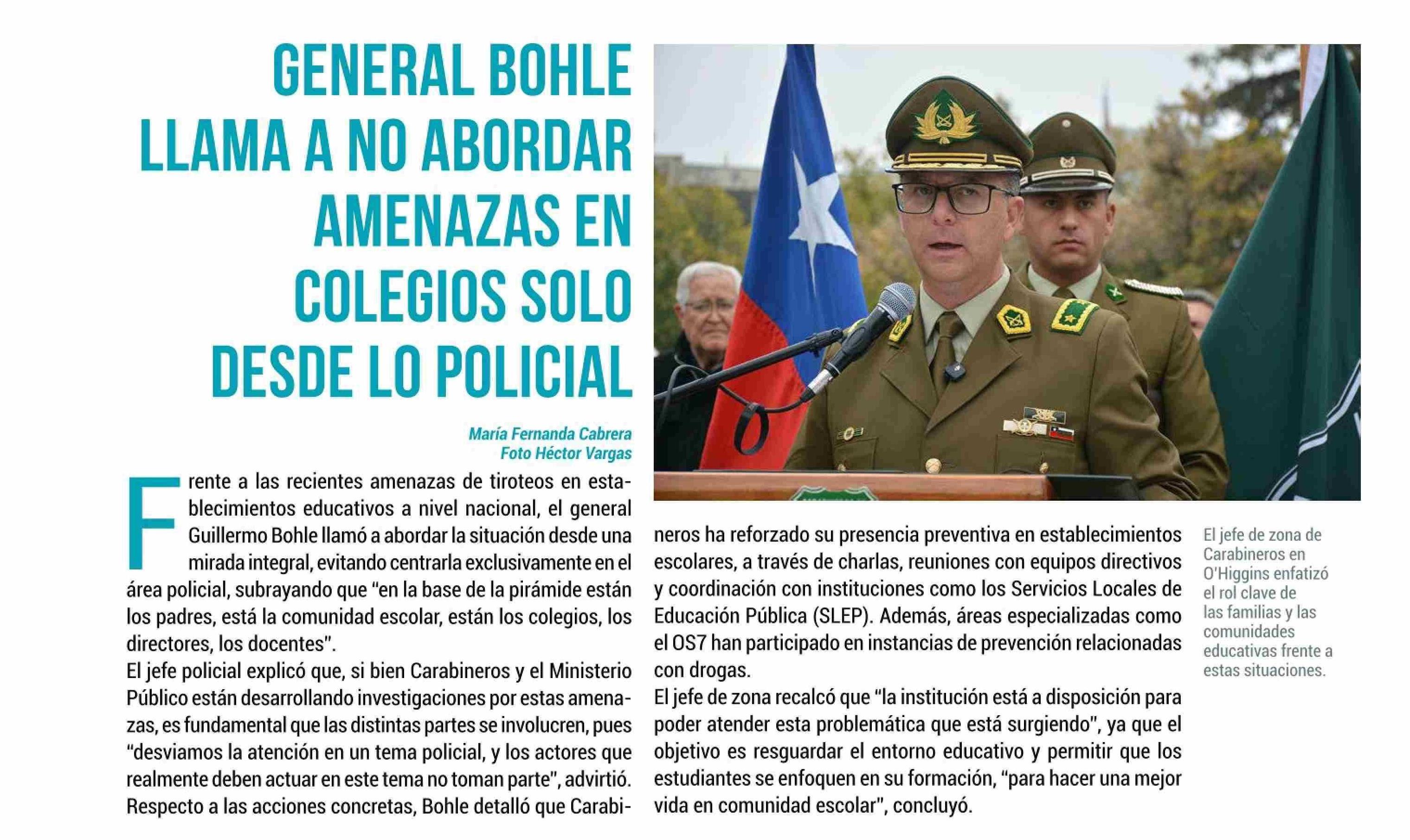 GENERAL BOHLE LLAMA A NO ABORDAR AMENAZAS EN COLEGIOS SOLO DESDE LO POLICIAL 11-04-2026 El Rancagüino |
