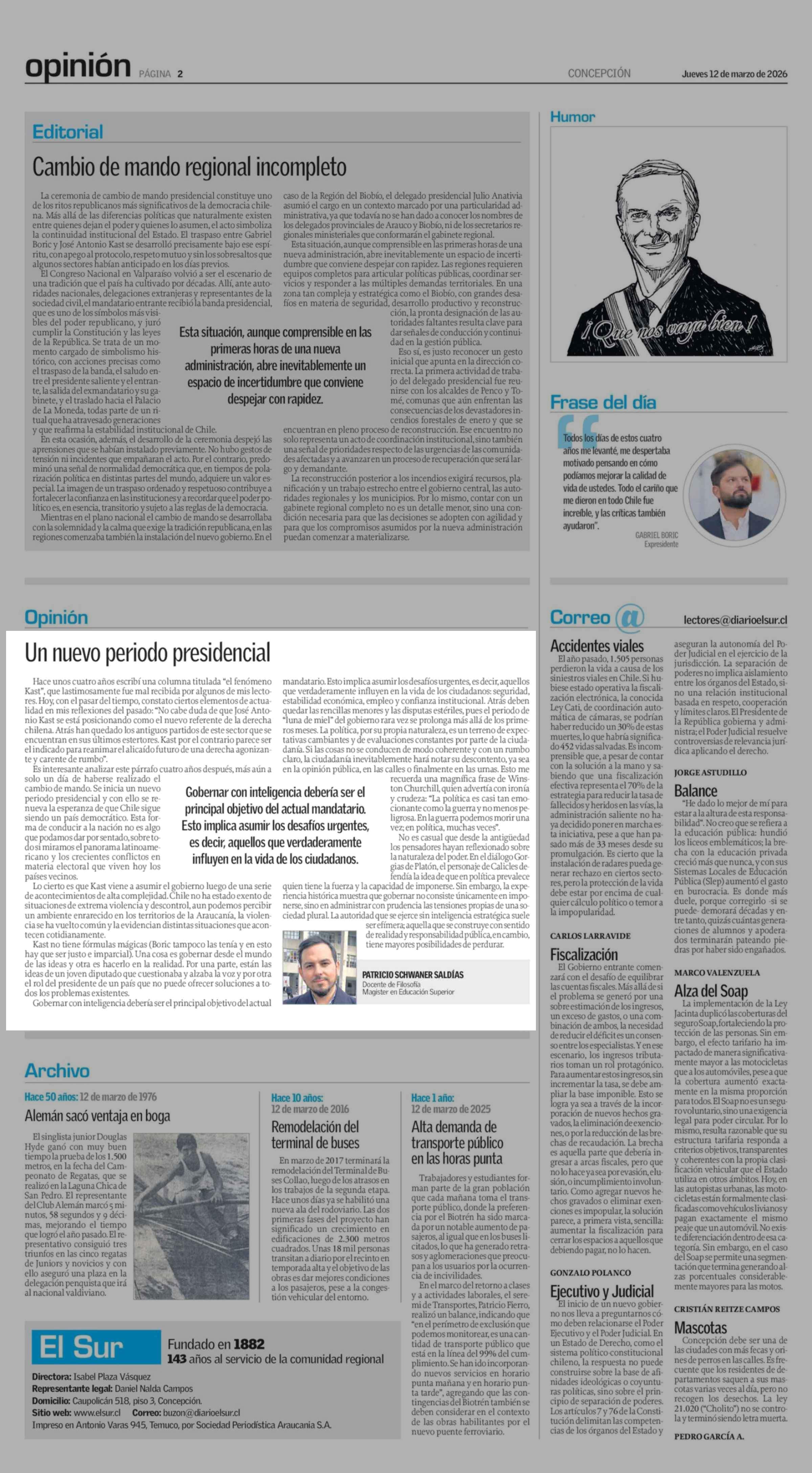 COLUMNAS DE OPINIÓN: Un nuevo periodo presidencial 12-03-2026 El Sur |