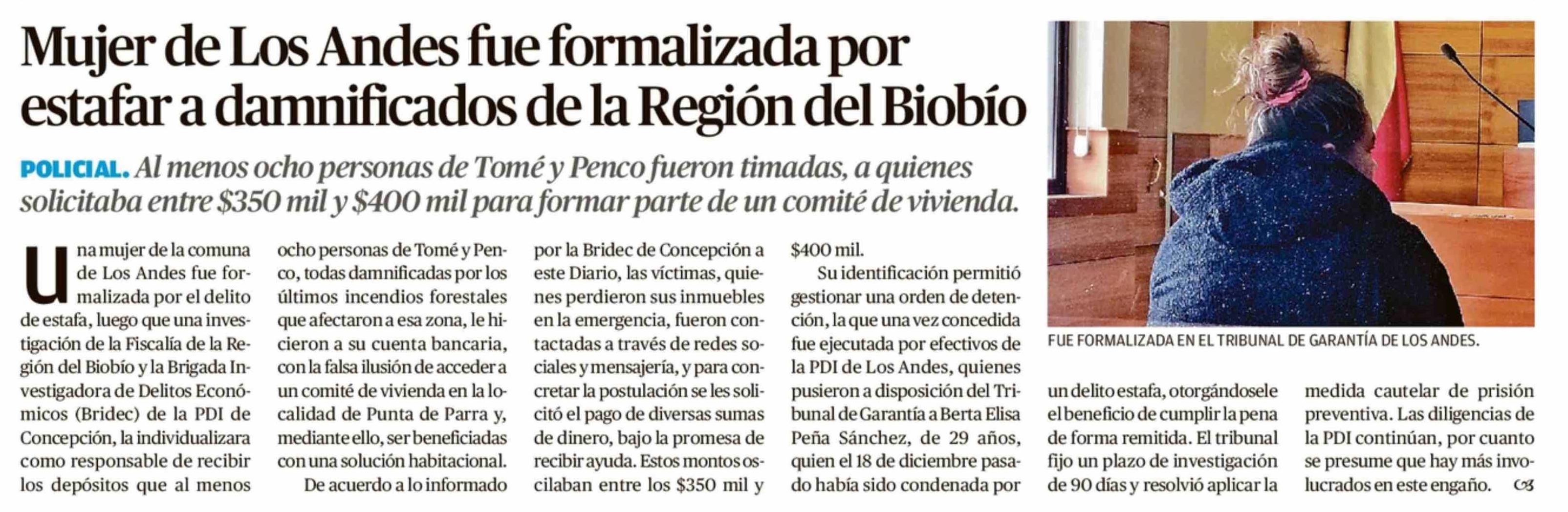 Título: Mujer de Los Andes fue formalizada por estafar a damnificados de la Región del Biobío