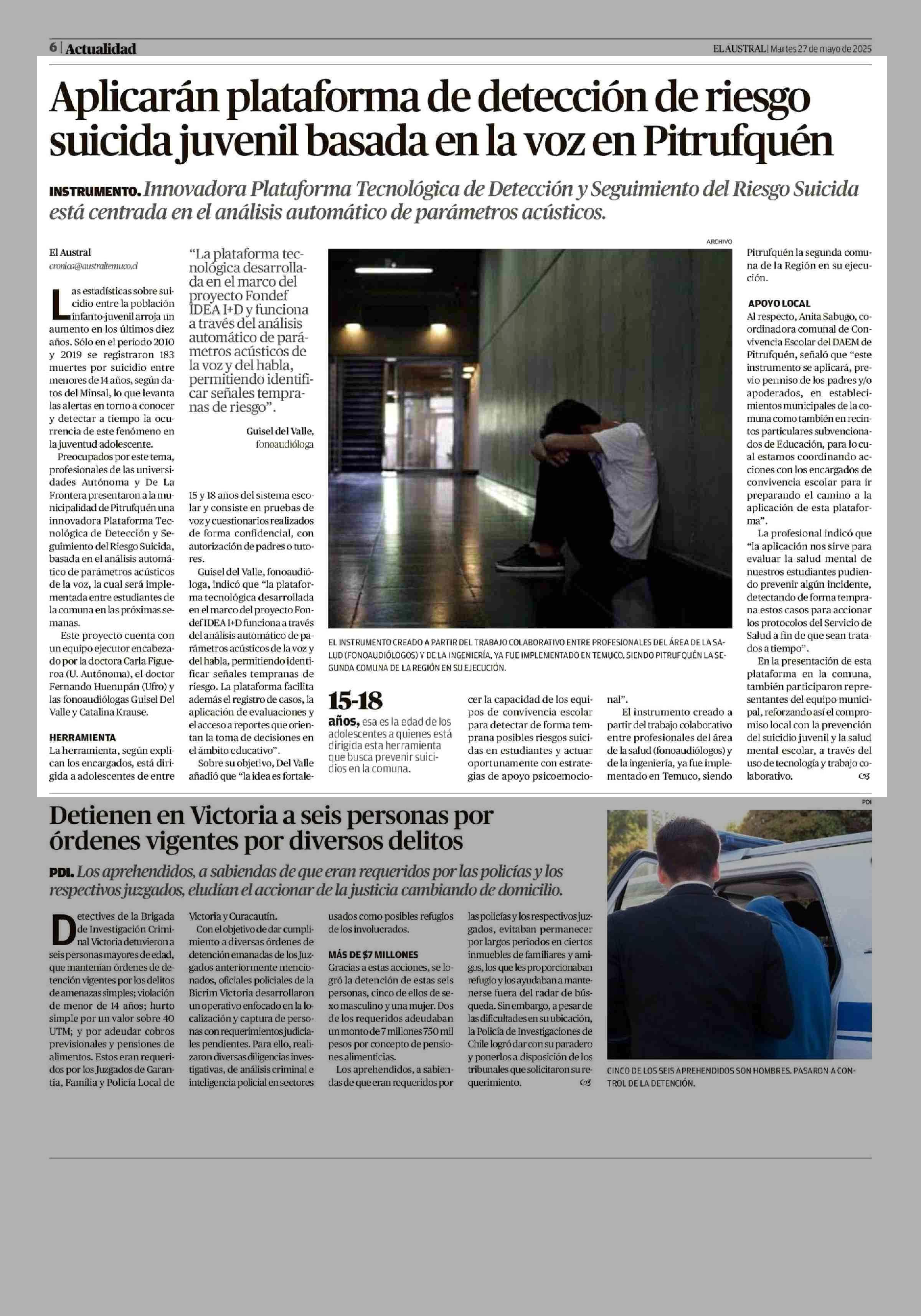 Aplicarán plataforma de detección de riesgo suicida juvenil basada en la voz en Pitrufquén 27-05-2025 El Austral de la Araucanía |