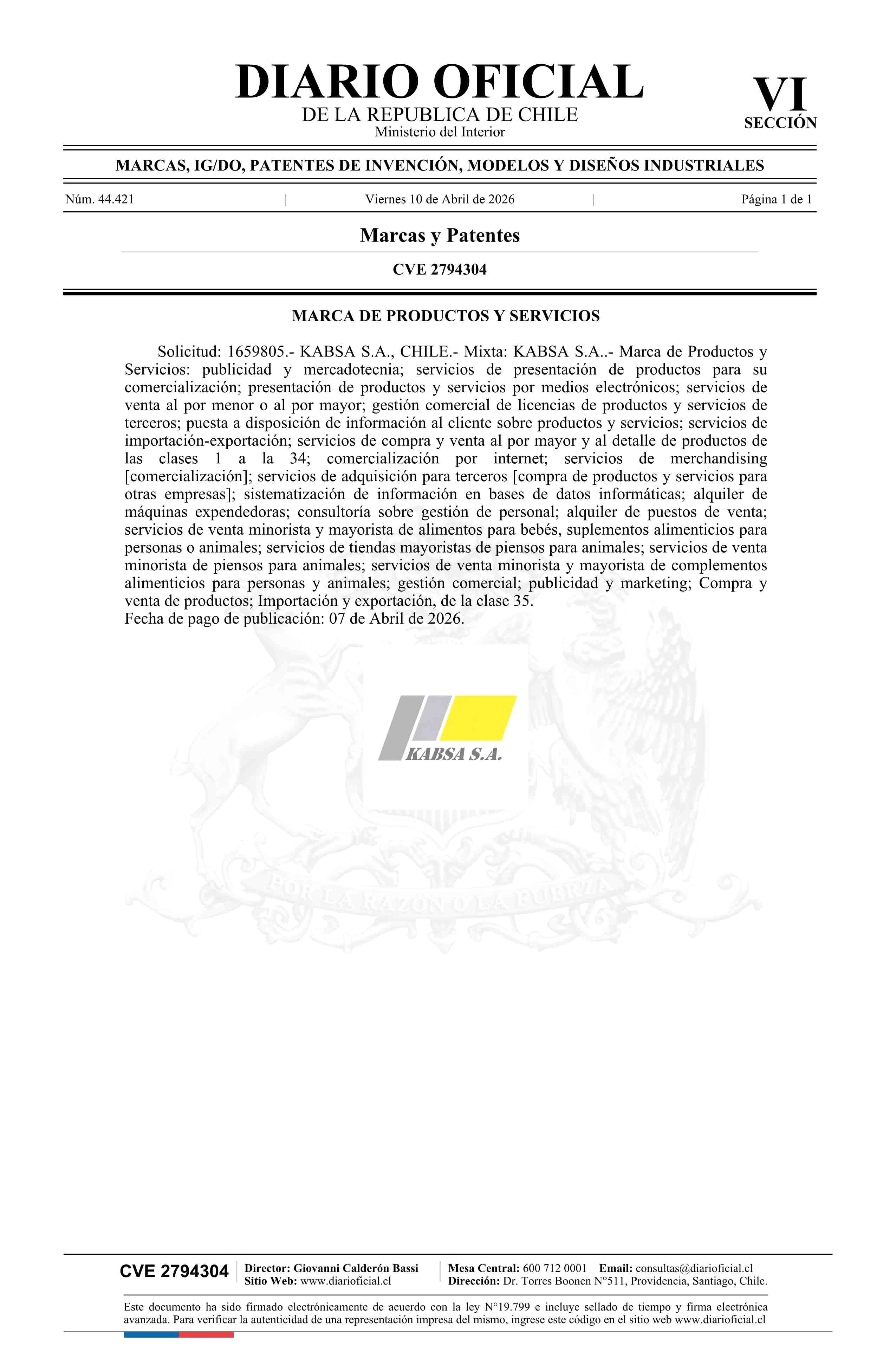 Solicitud número 1659805.- KABSA S.A. 10-04-2026 Diario Oficial Edición Electrónica |