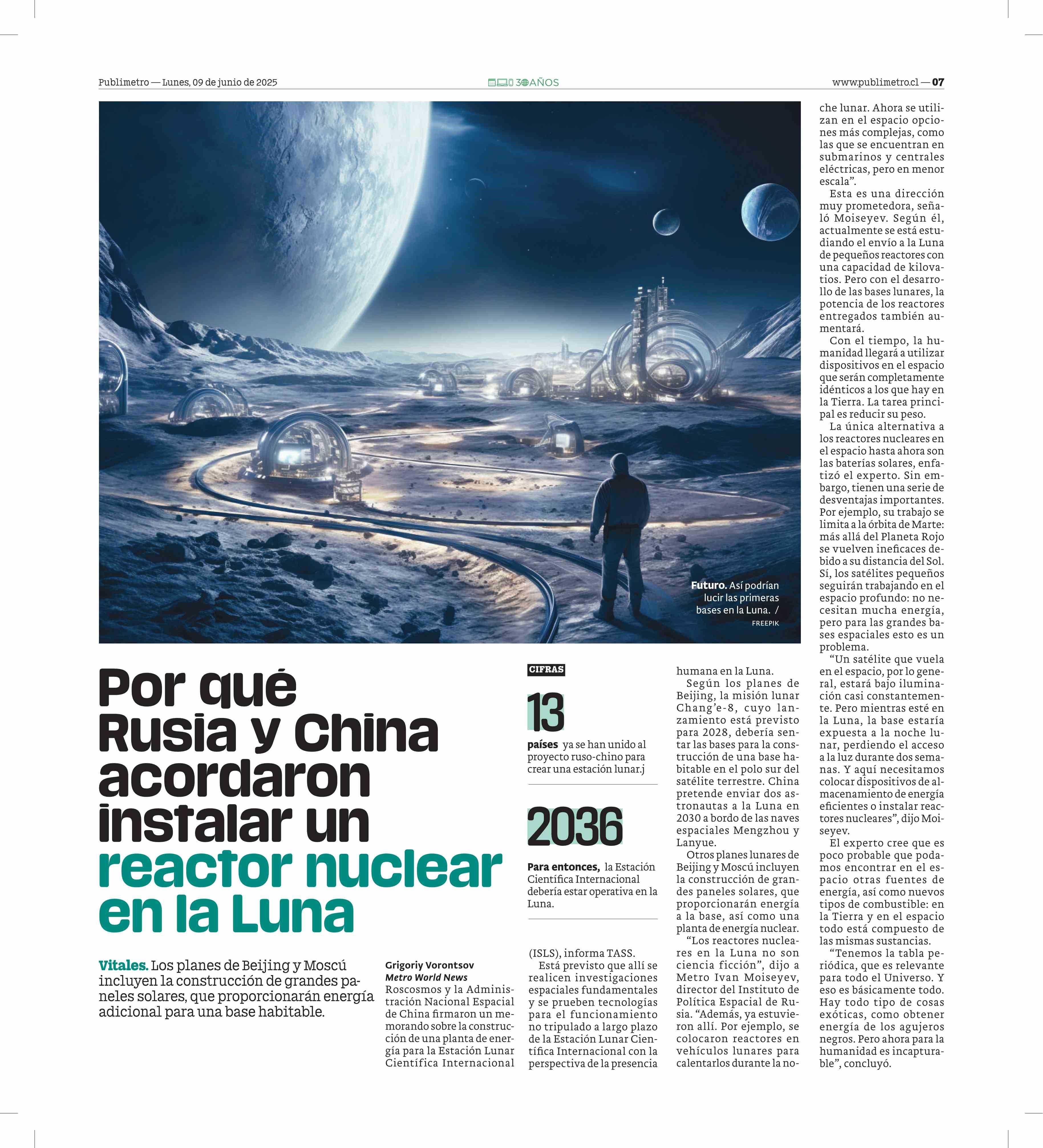 Por qué Rusia y China acordaron instalar un reactor nuclear en la Luna 09-06-2025 Publimetro |