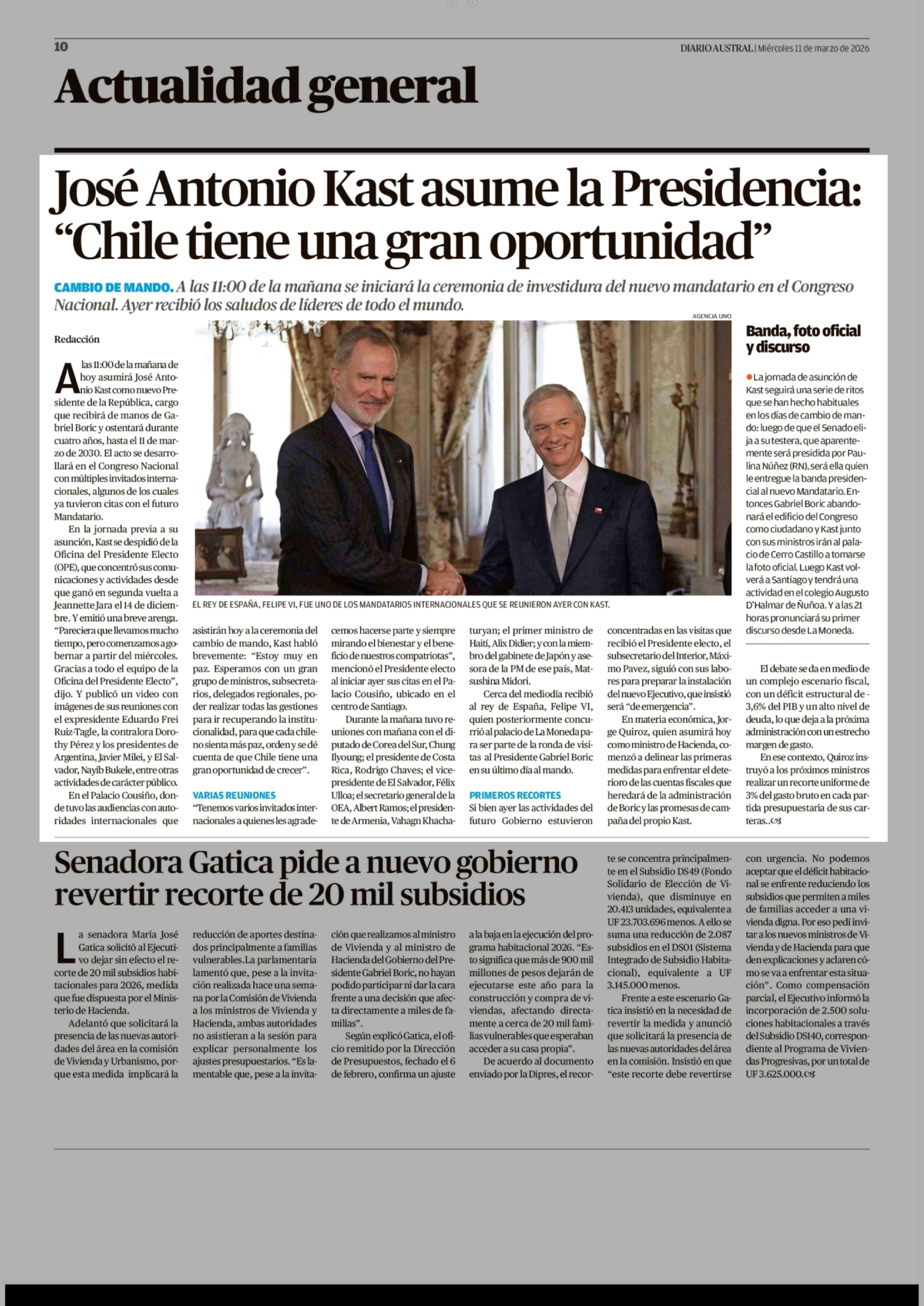 José Antonio Kast asume la Presidencia: "Chile tiene una gran oportunidad" 11-03-2026 Diario Austral Región de Los Ríos |