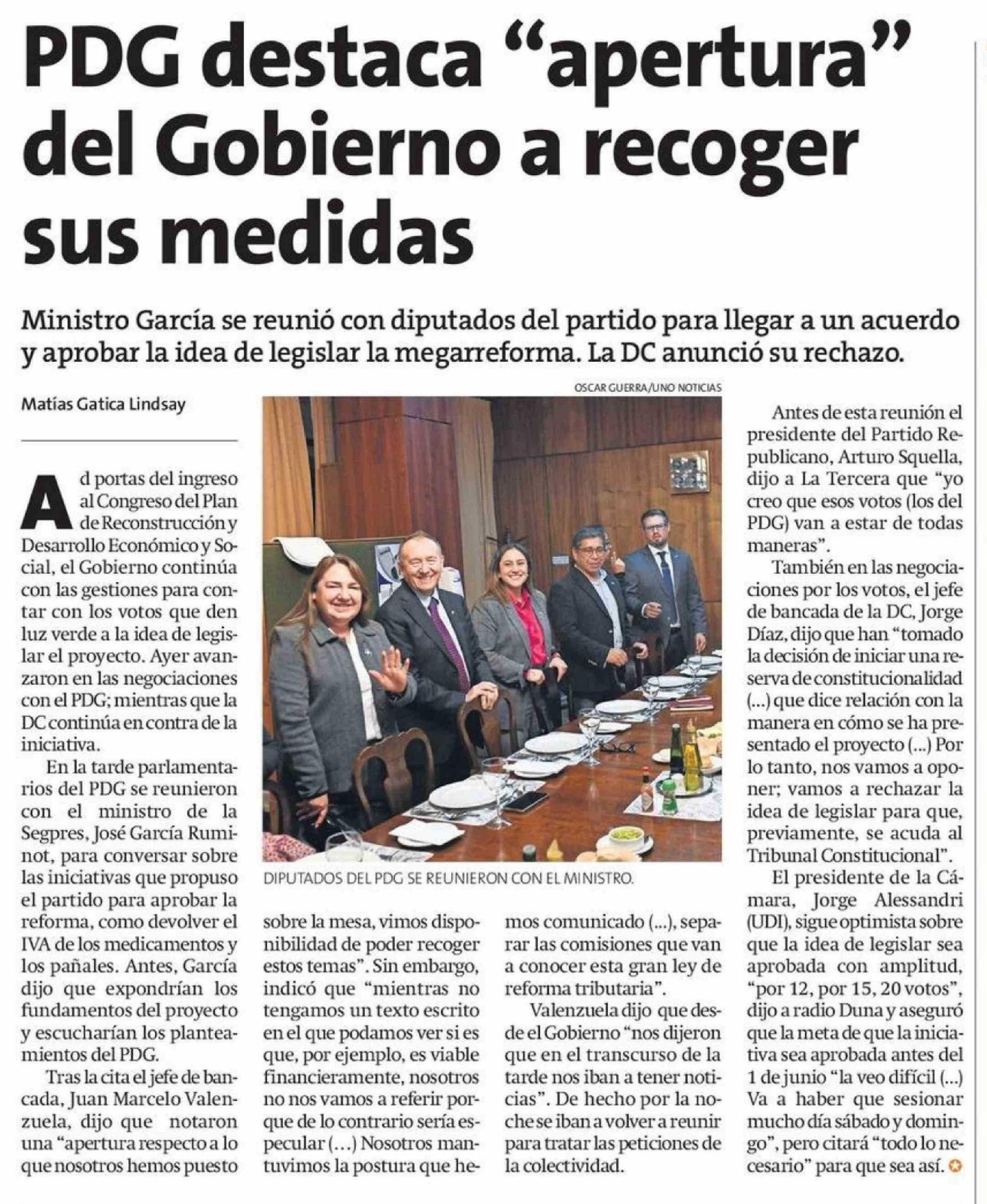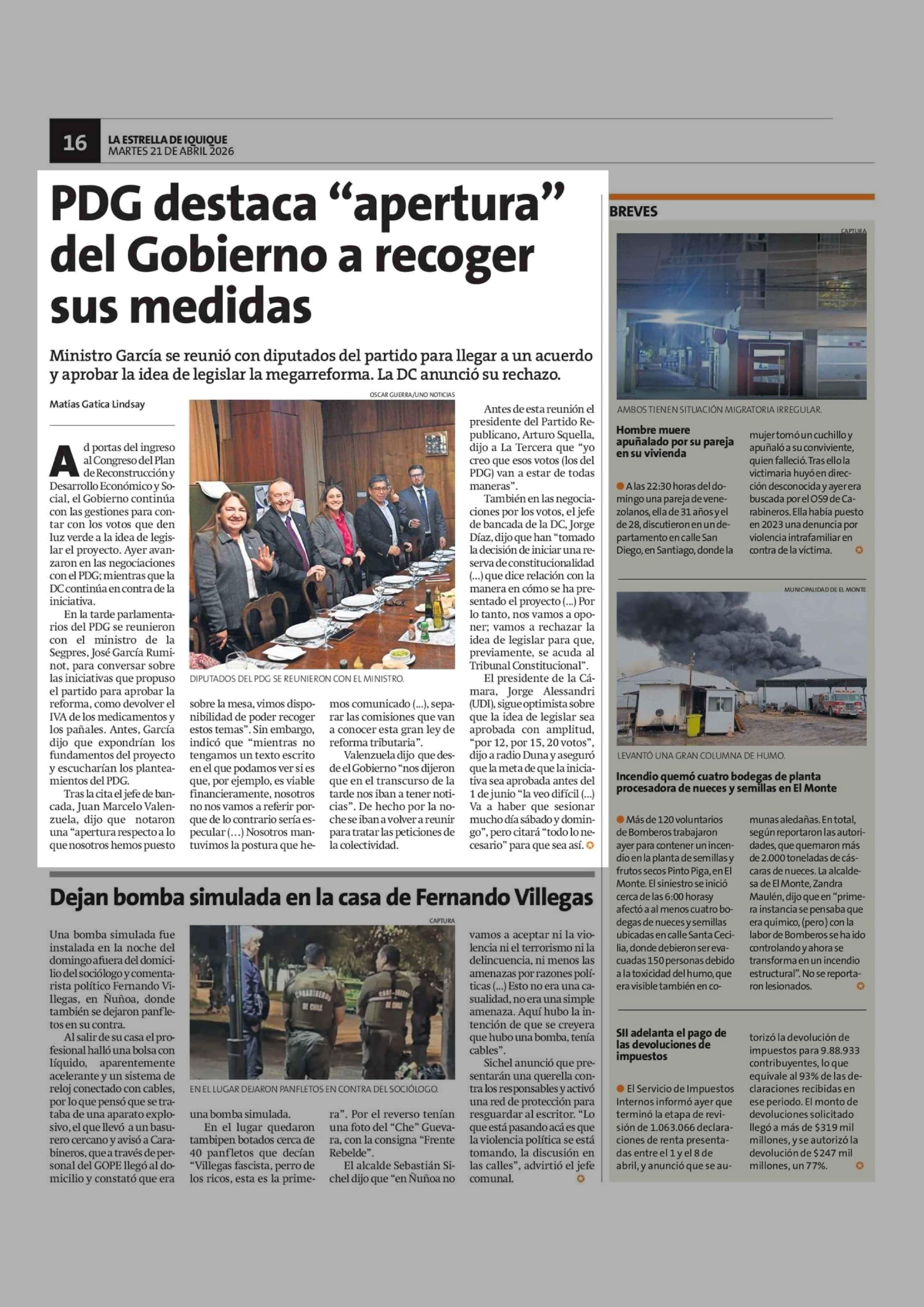 PDG destaca "apertura" sus medidas del Gobierno a recoger 21-04-2026 La Estrella de Iquique |