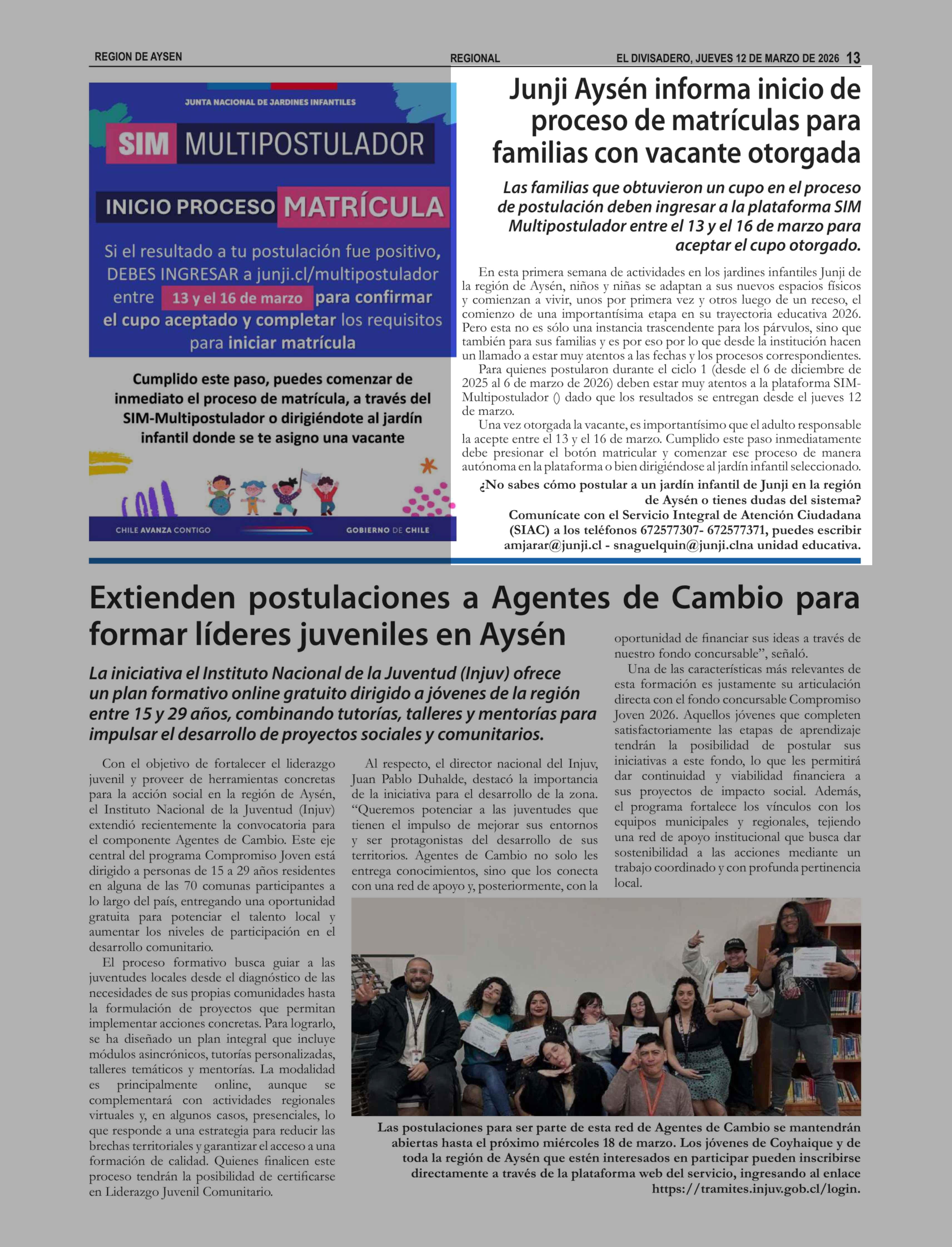 Junji Aysén informa inicio de proceso de matrículas para familias con vacante otorgada 12-03-2026 El Divisadero |