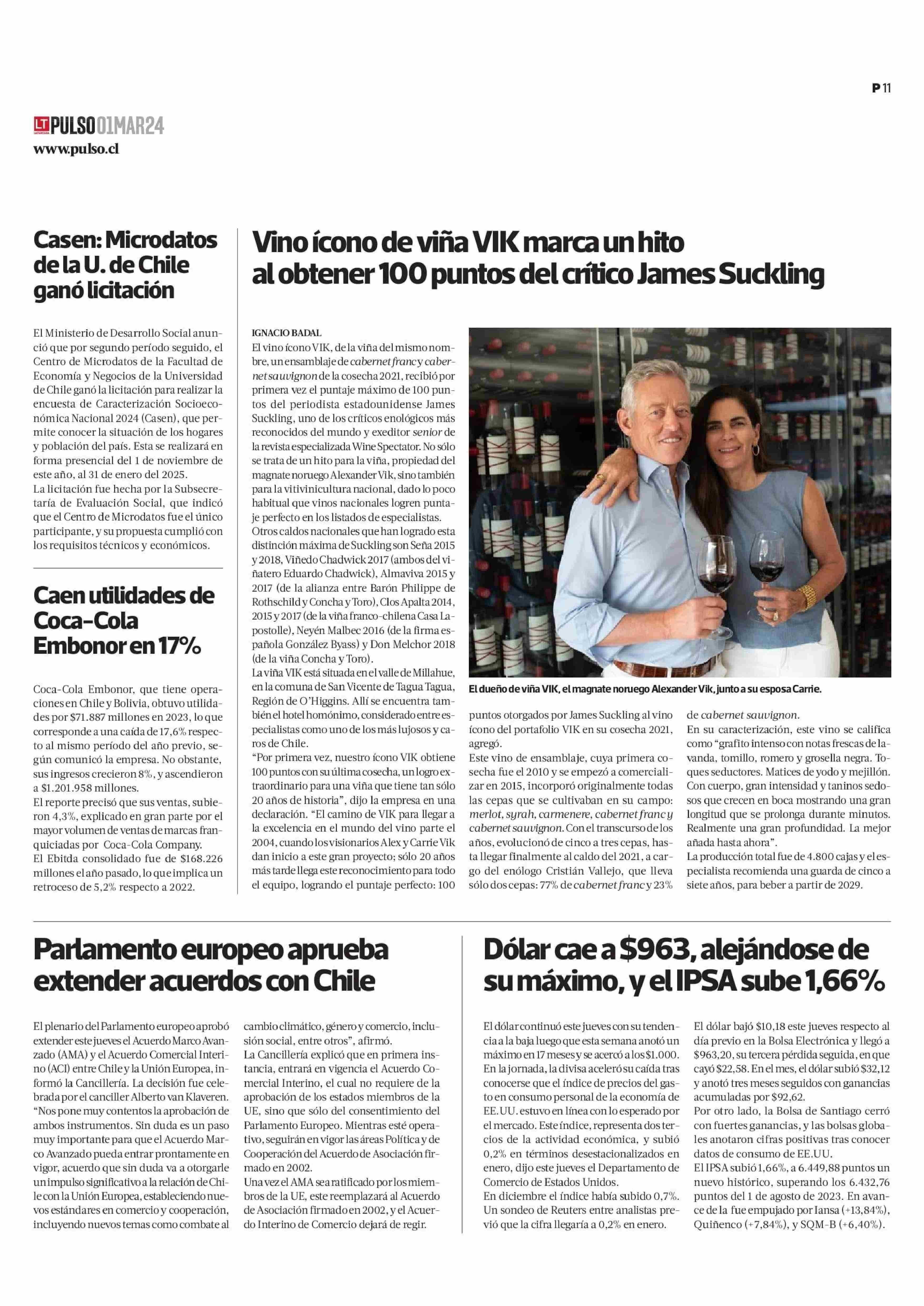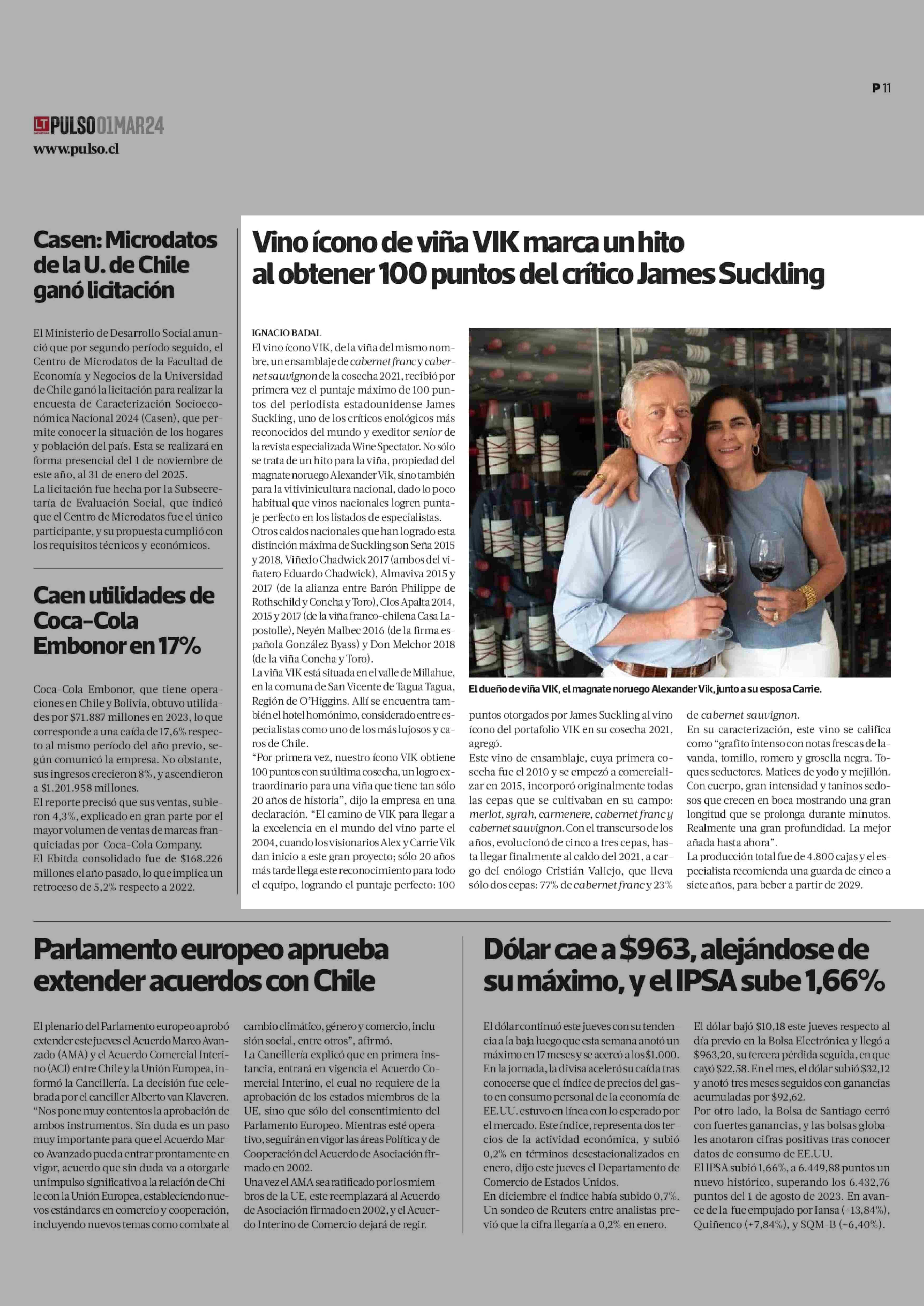 Vino ícono de viña VIK marca un hito al obtener 100 puntos del crítico James Suckling 01-03-2024 La Tercera |