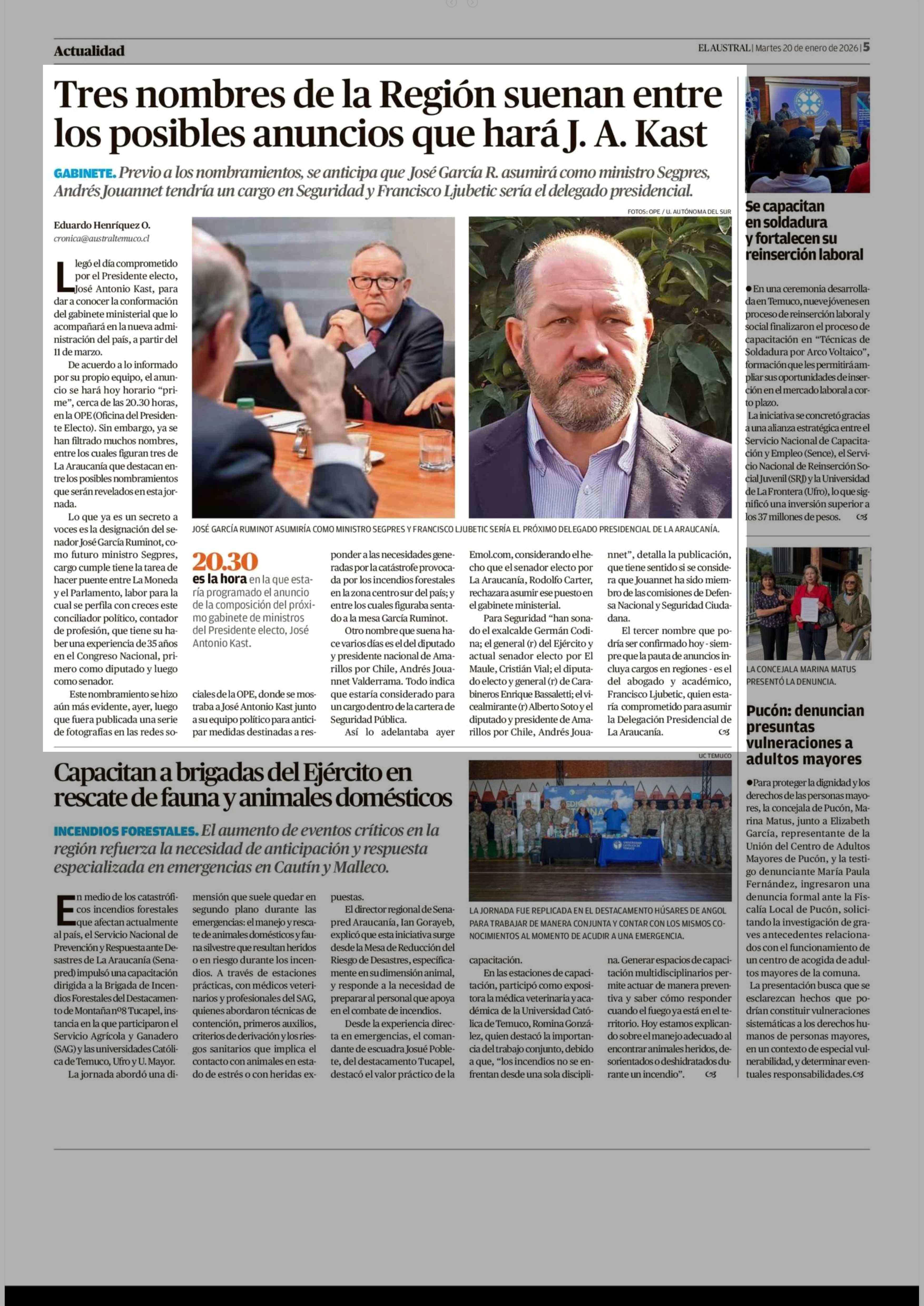 Tres nombres de la Región suenan entre los posibles anuncios que hará J. A. Kast 20-01-2026 El Austral de la Araucanía |