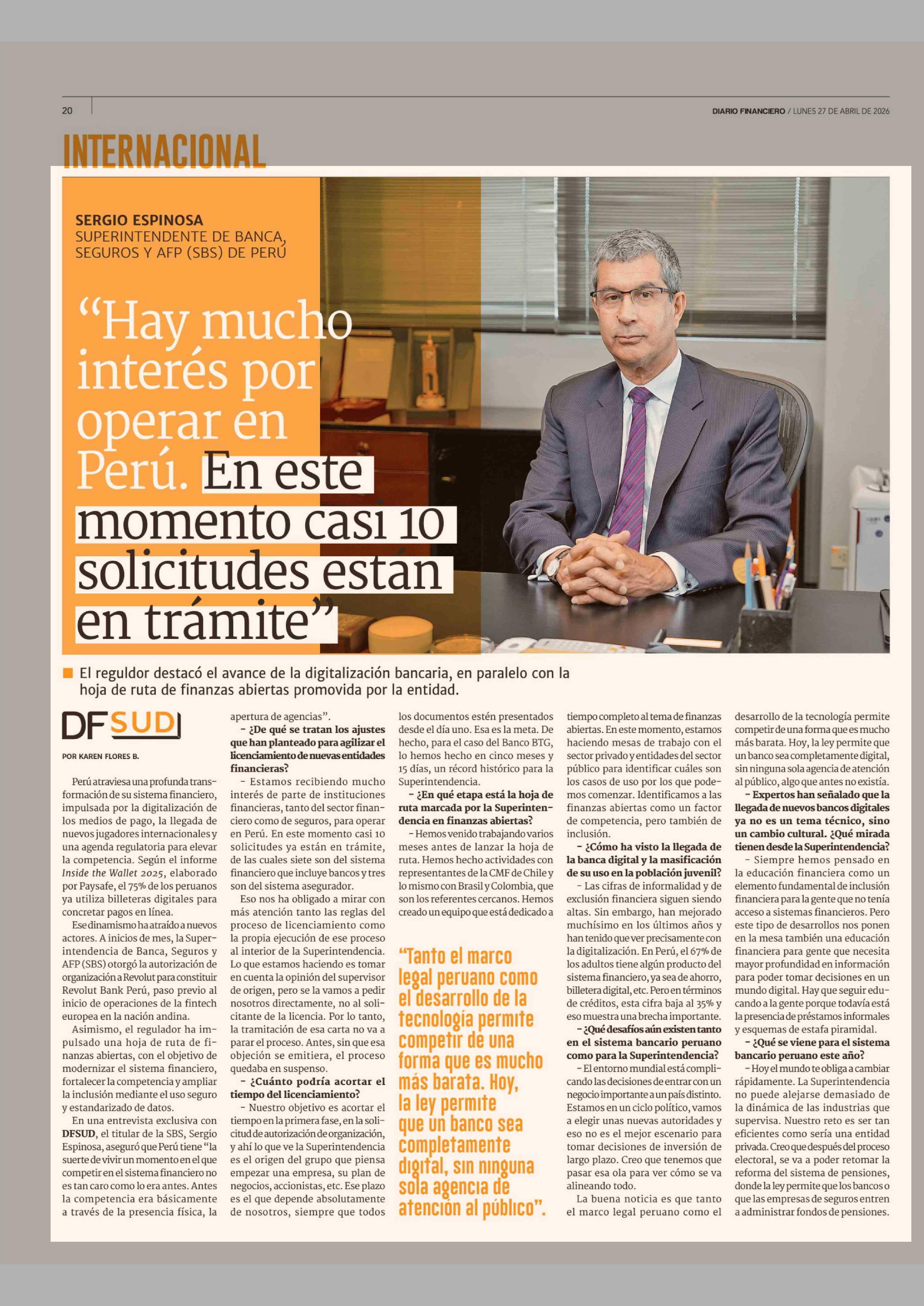 "Hay mucho interés por operar en Perú. En este momento casi 10 solicitudes estan en trámite" 27-04-2026 Diario Financiero |