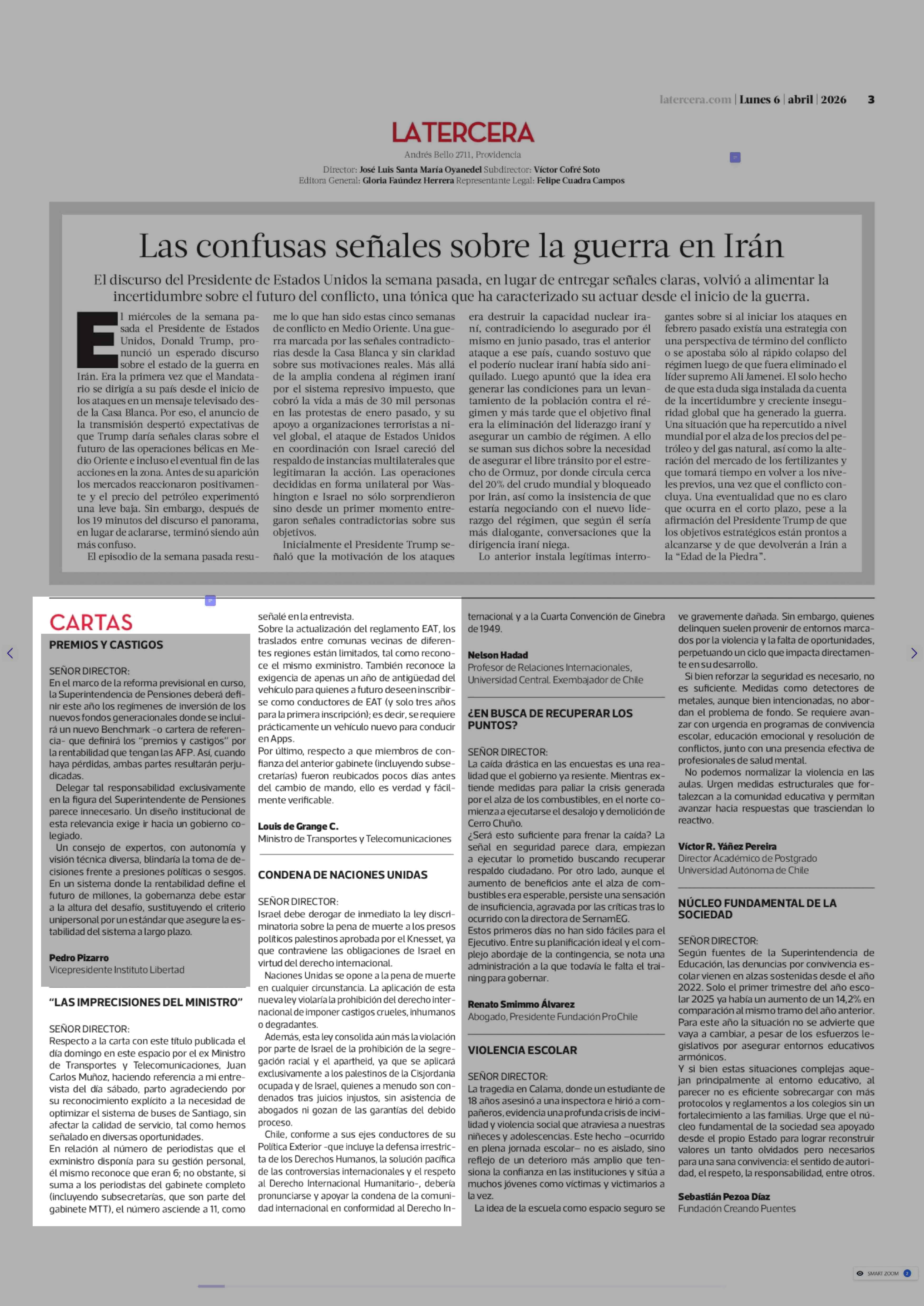 CARTAS: "LAS IMPRECISIONES DEL MINISTRO" 06-04-2026 La Tercera |