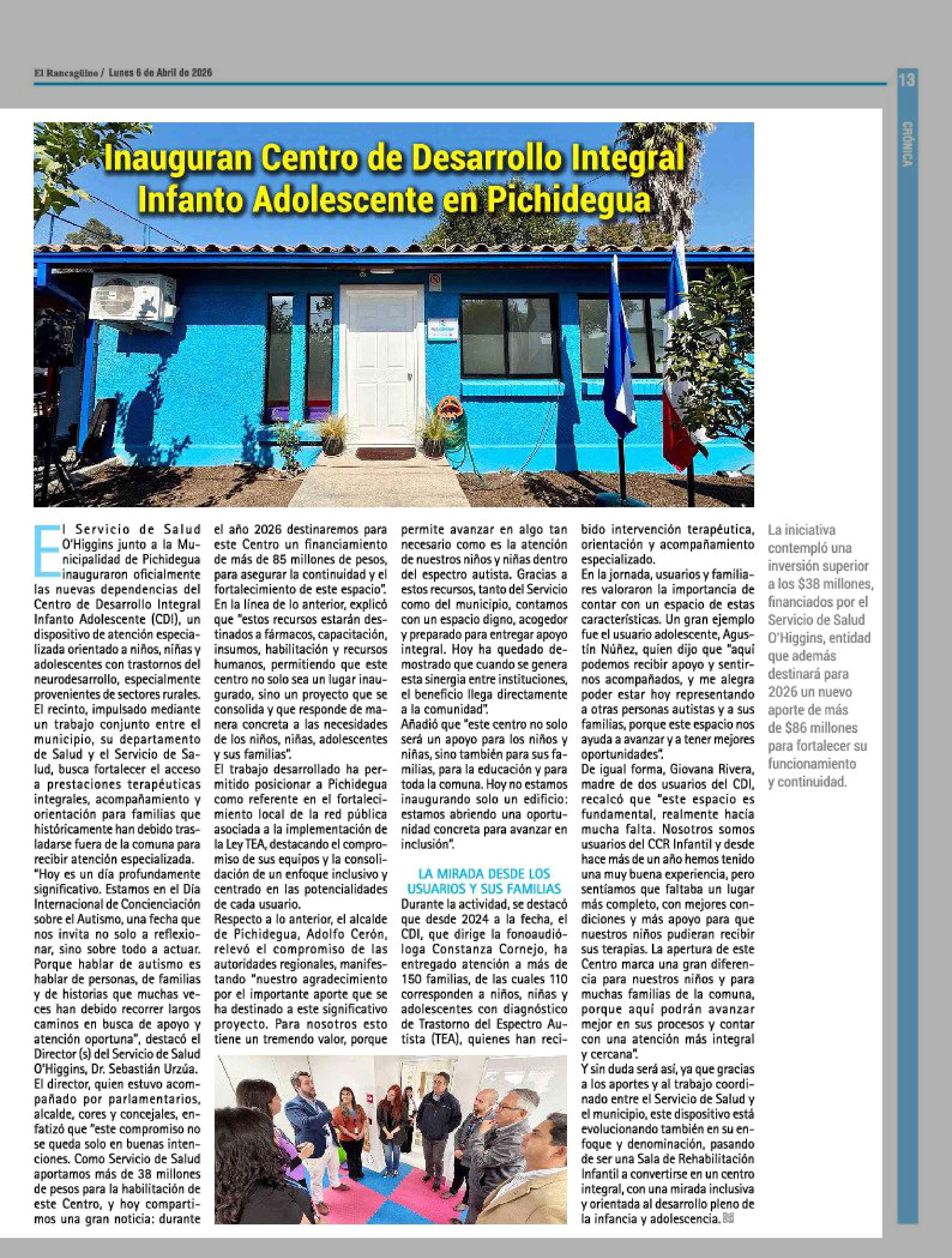 Título: Inauguran centro de desarrollo integral infanto adolescente en Pichidegua