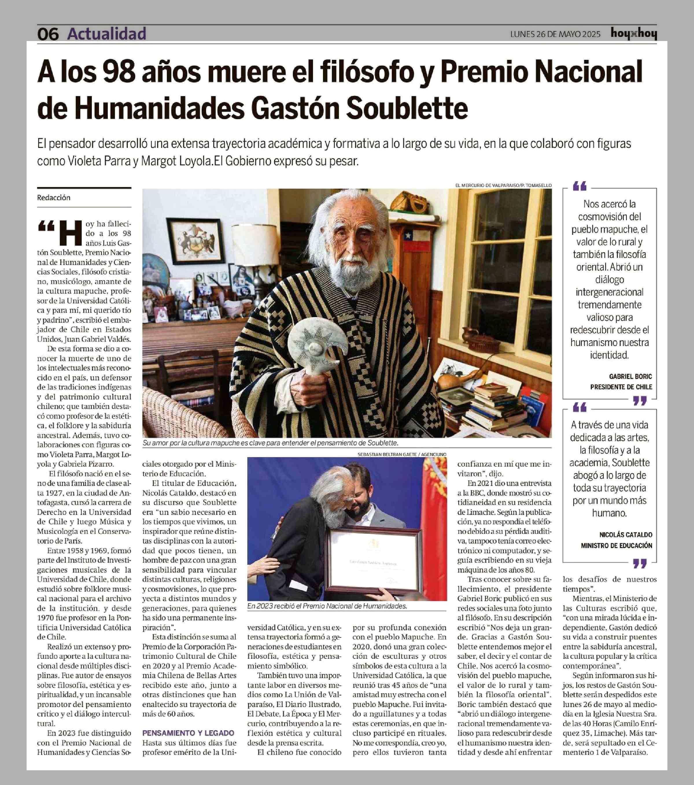 A los 98 años muere el filósofo y Premio Nacional de Humanidades Gastón Soublette 26-05-2025 Hoy x Hoy Antofagasta |