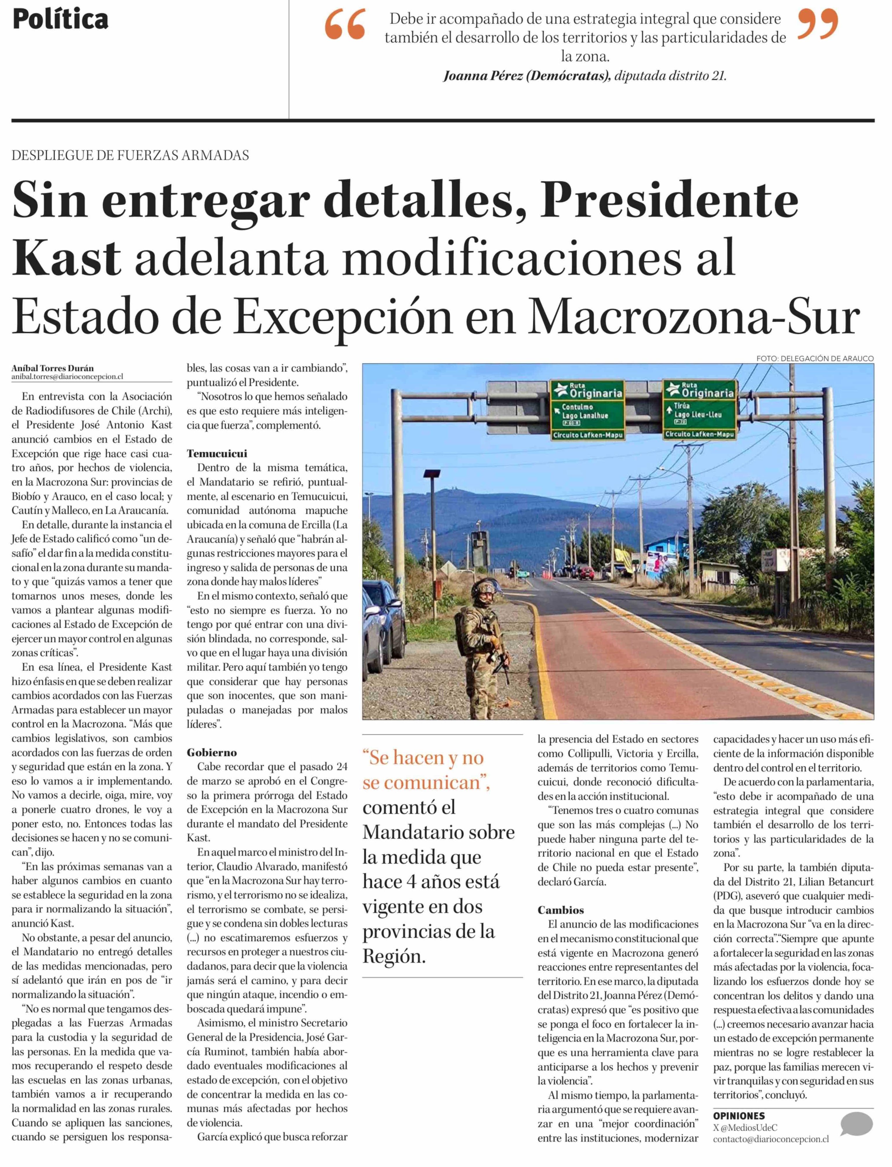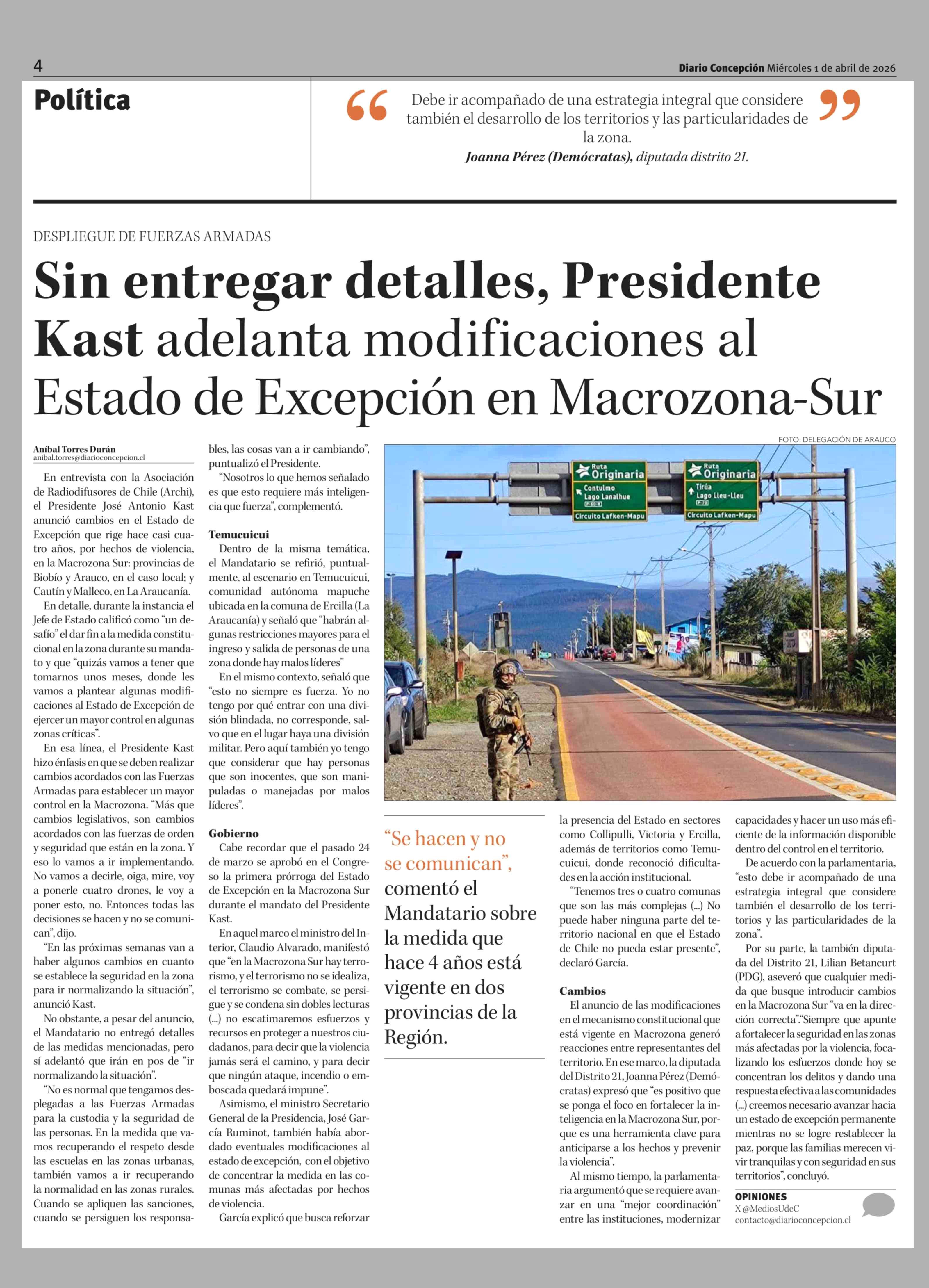 Sin entregar detalles, Presidente Kast adelanta modificaciones al Estado de Excepción en Macrozona-Sur 02-04-2026 Diario Concepción |