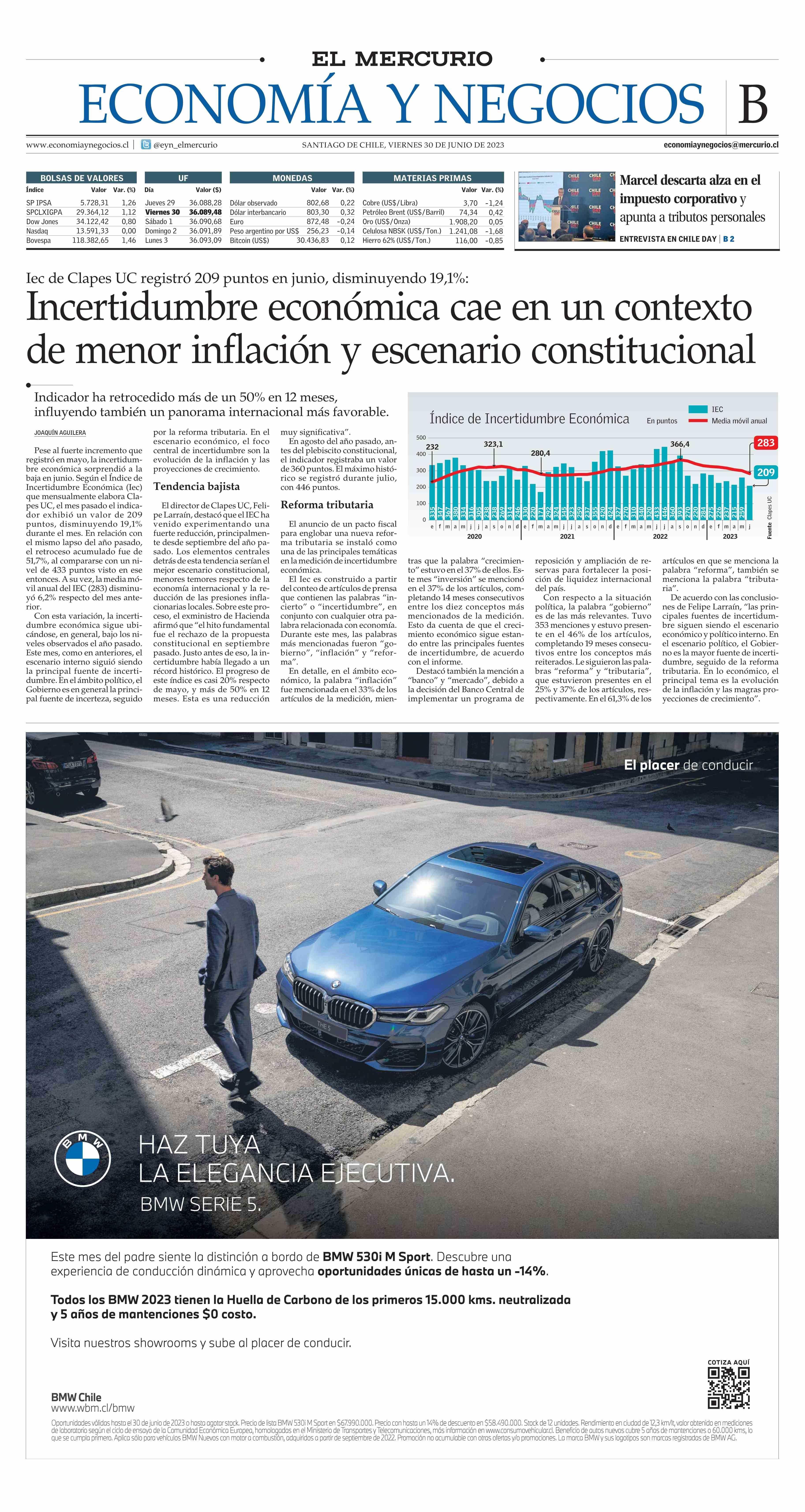Incertidumbre económica cae en un contexto de menor inflación y escenario constitucional 30-06-2023 El Mercurio |