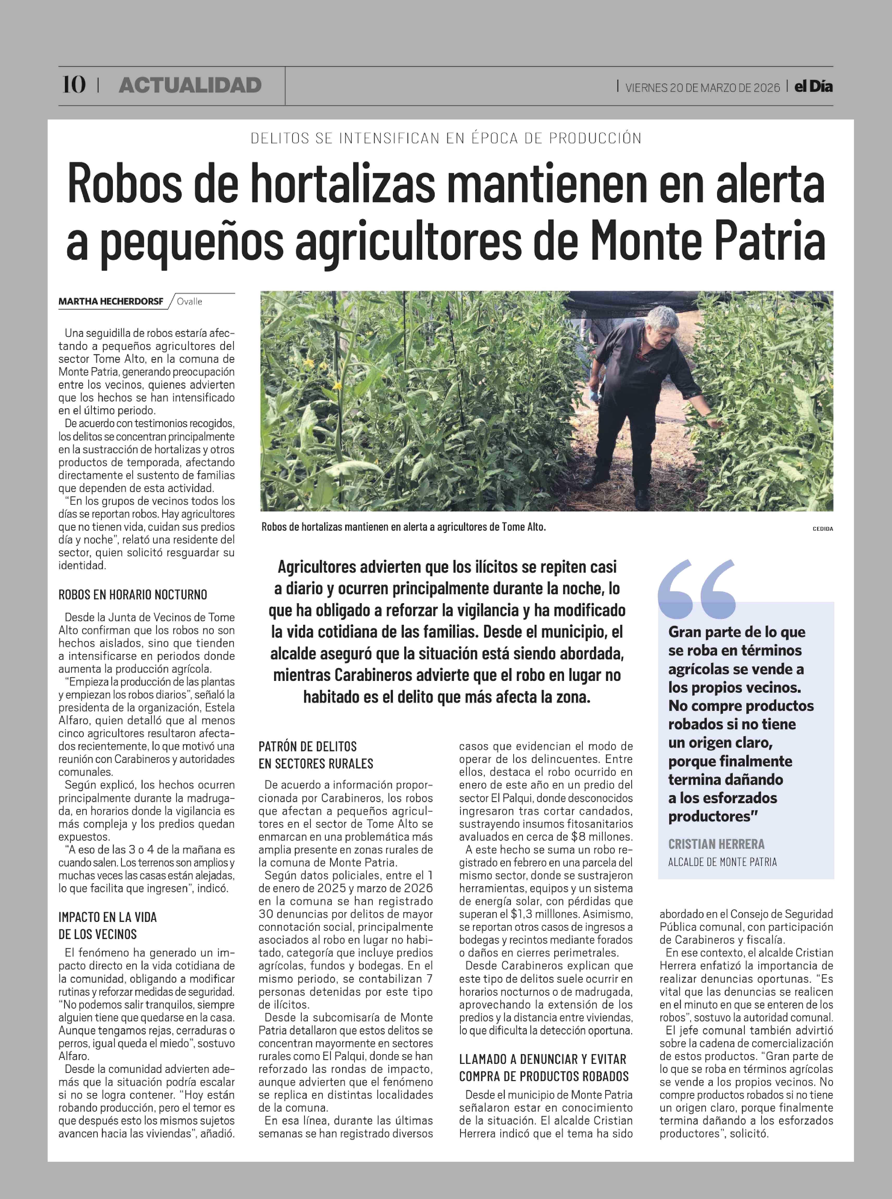 Robos de hortalizas mantienen en alerta a pequeños agricultores de Monte Patria 20-03-2026 El Día |