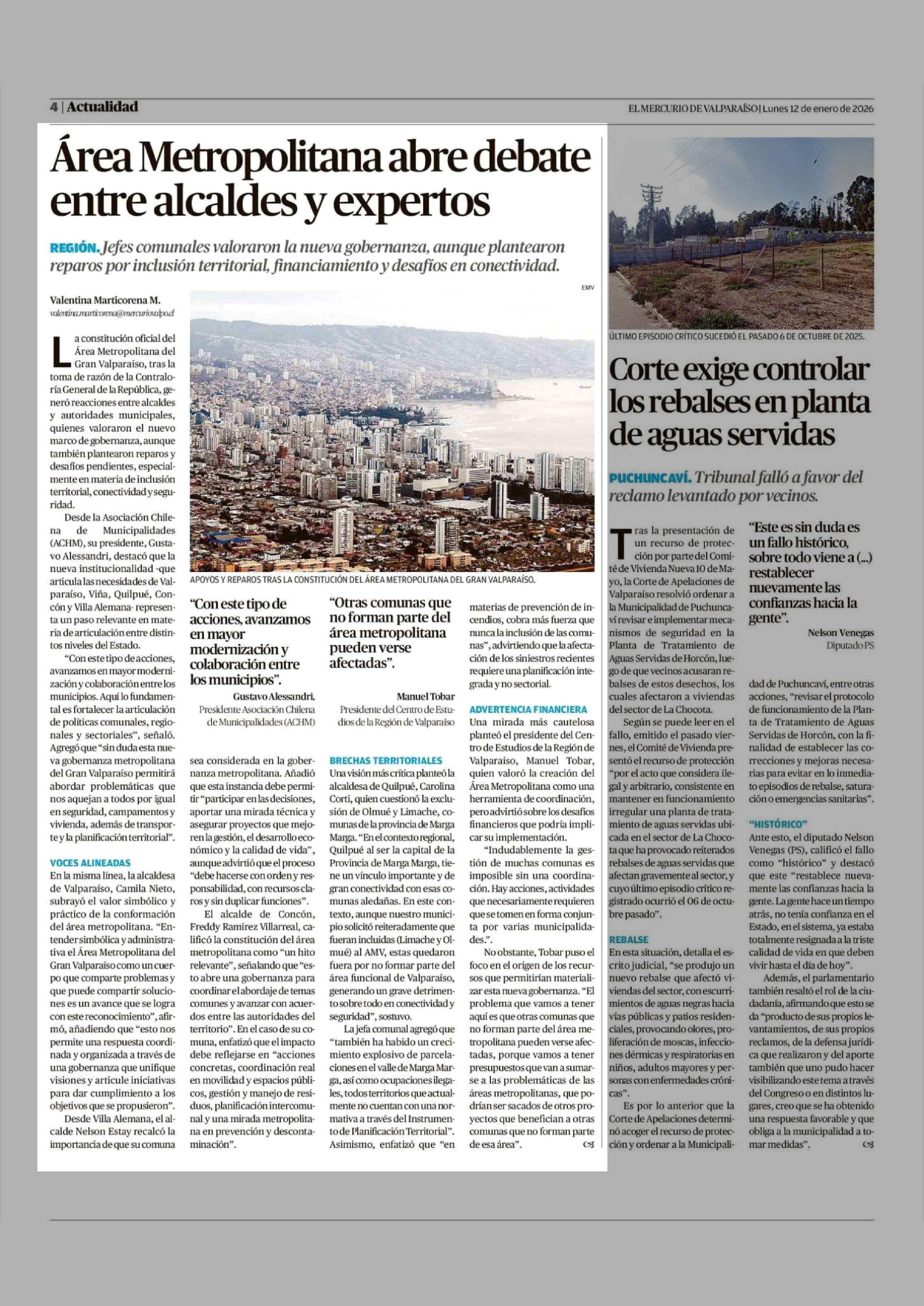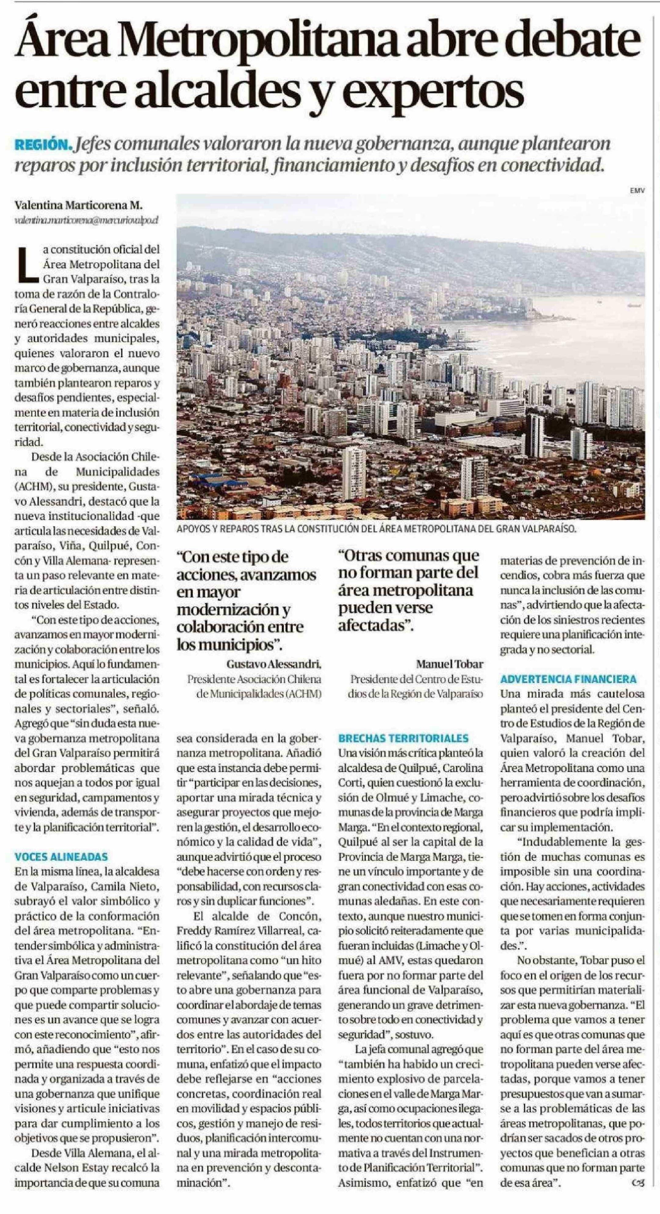 Área Metropolitana abre debate entre alcaldes y expertos 12-01-2026 El Mercurio de Valparaíso |