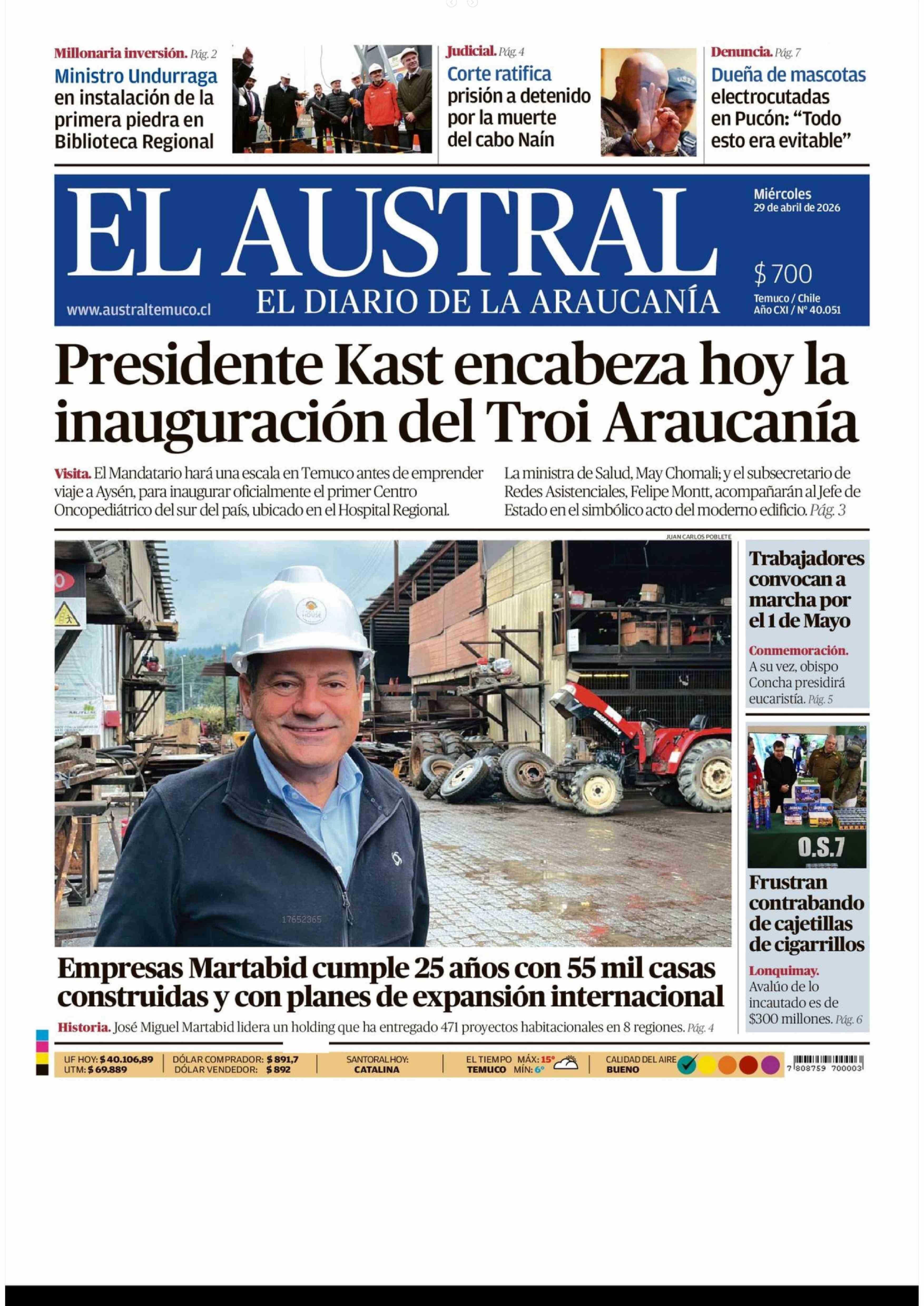 PORTADA EL AUSTRAL DE LA ARAUCANÍA CHILE 29-04-2026 El Austral de la Araucanía |