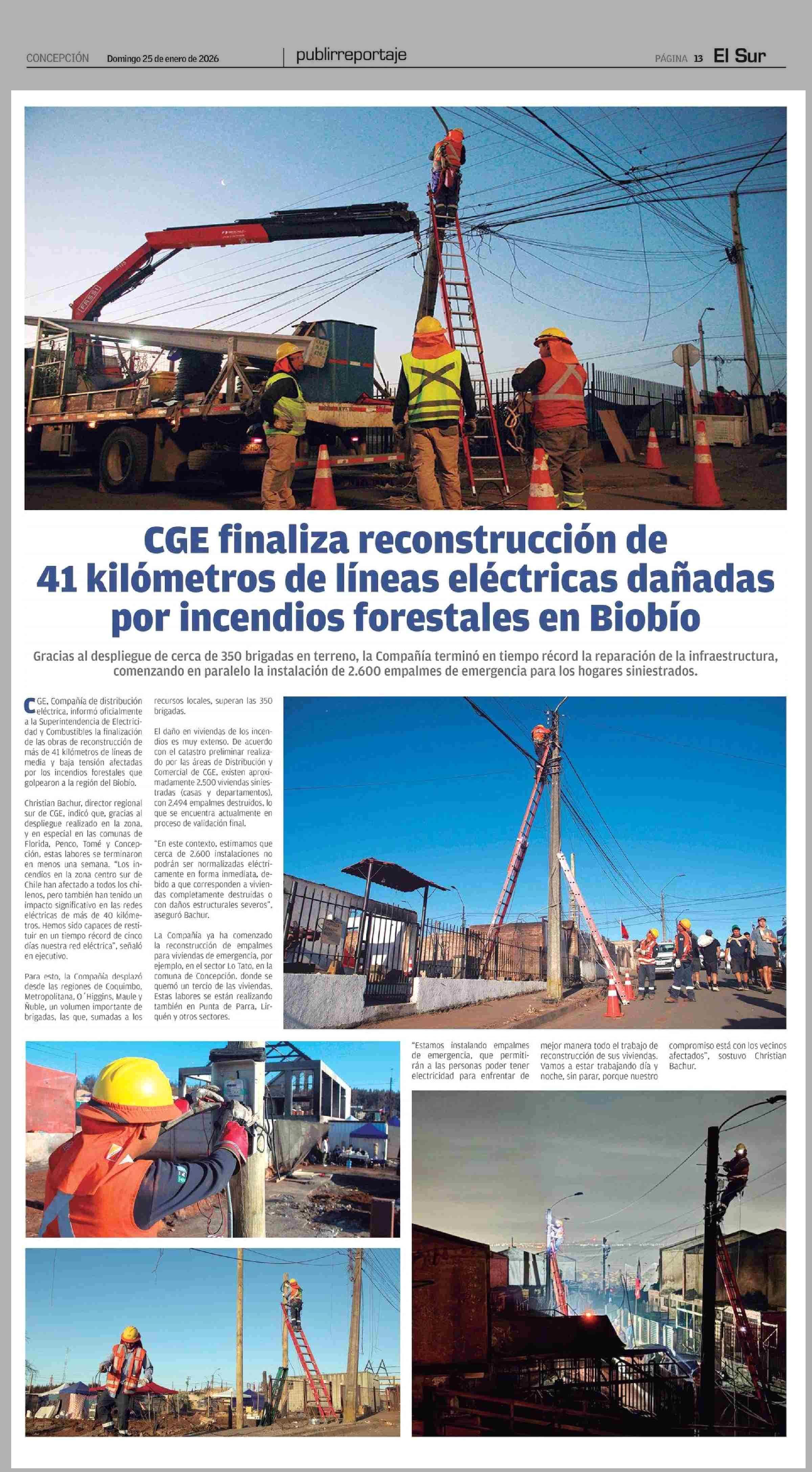 Título: CGE finaliza reconstrucción de 41 kilómetros de líneas eléctricas dañadas por incendios forestales en Biobio