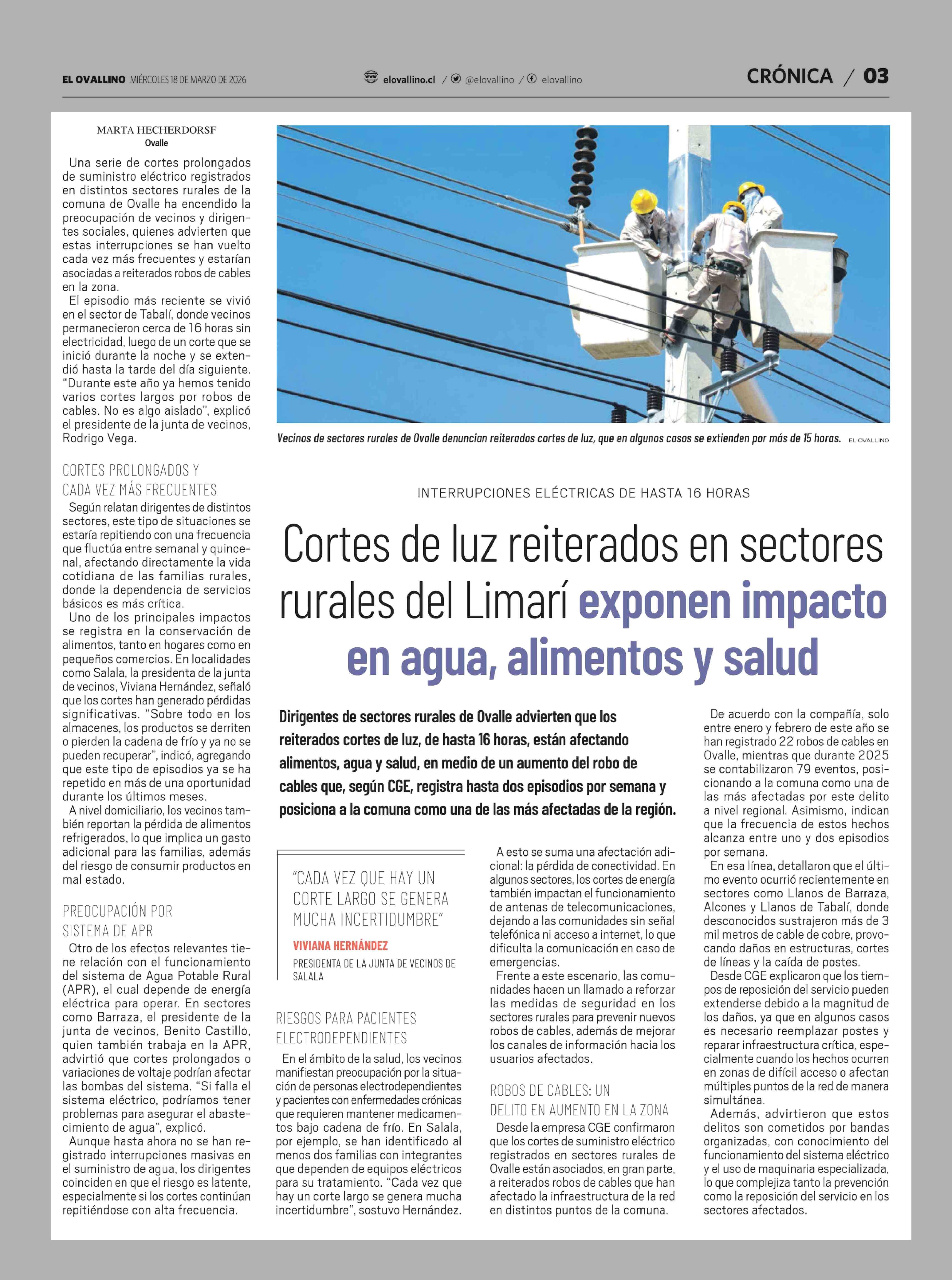 Cortes de luz reiterados en sectores rurales del Limarí exponen impacto en agua, alimentos y salud 18-03-2026 El Ovallino |