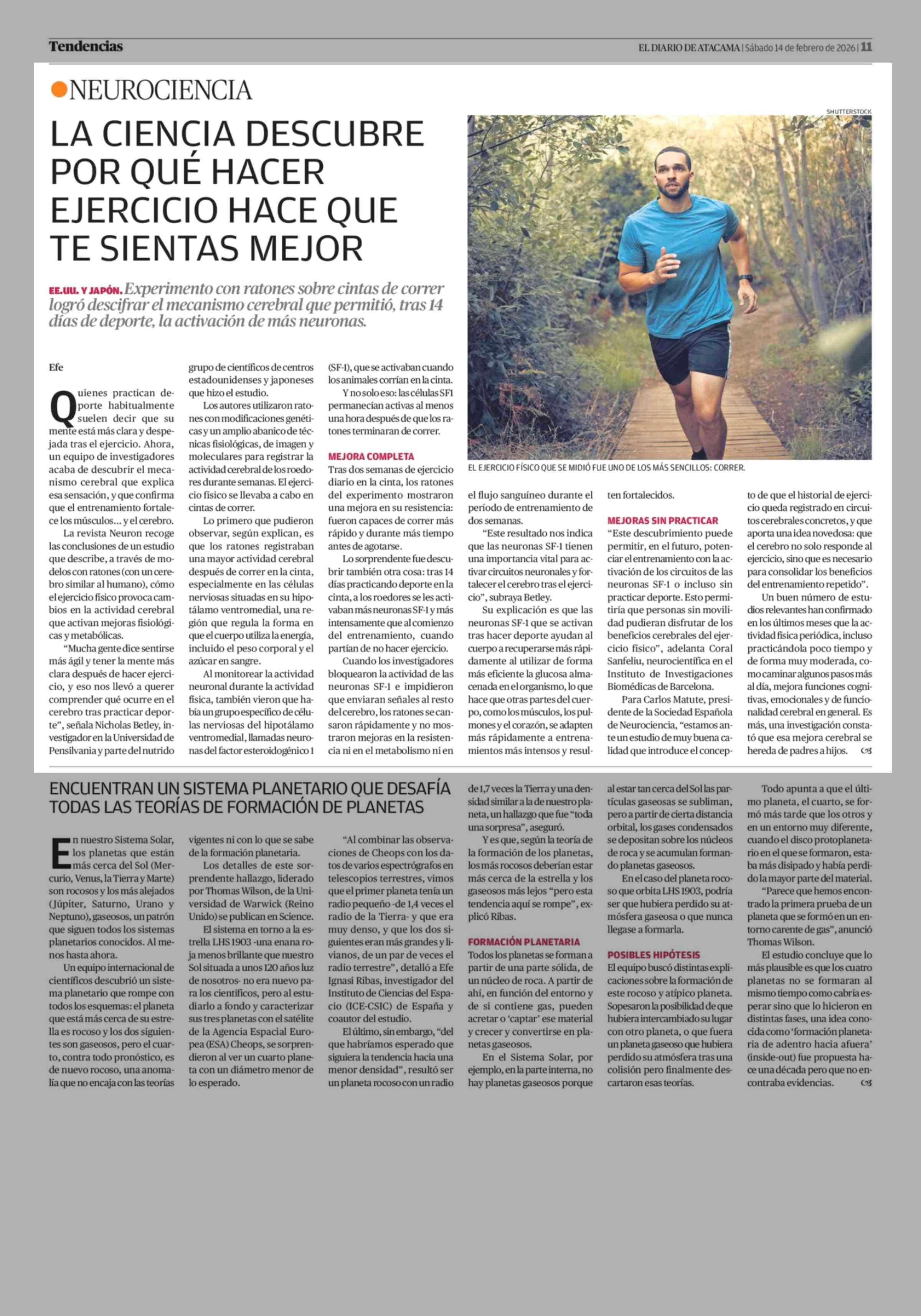 LA CIENCIA DESCUBRE POR QUÉ HACER EJERCICIO HACE QUE TE SIENTAS MEJOR 14-02-2026 El Diario de Atacama |