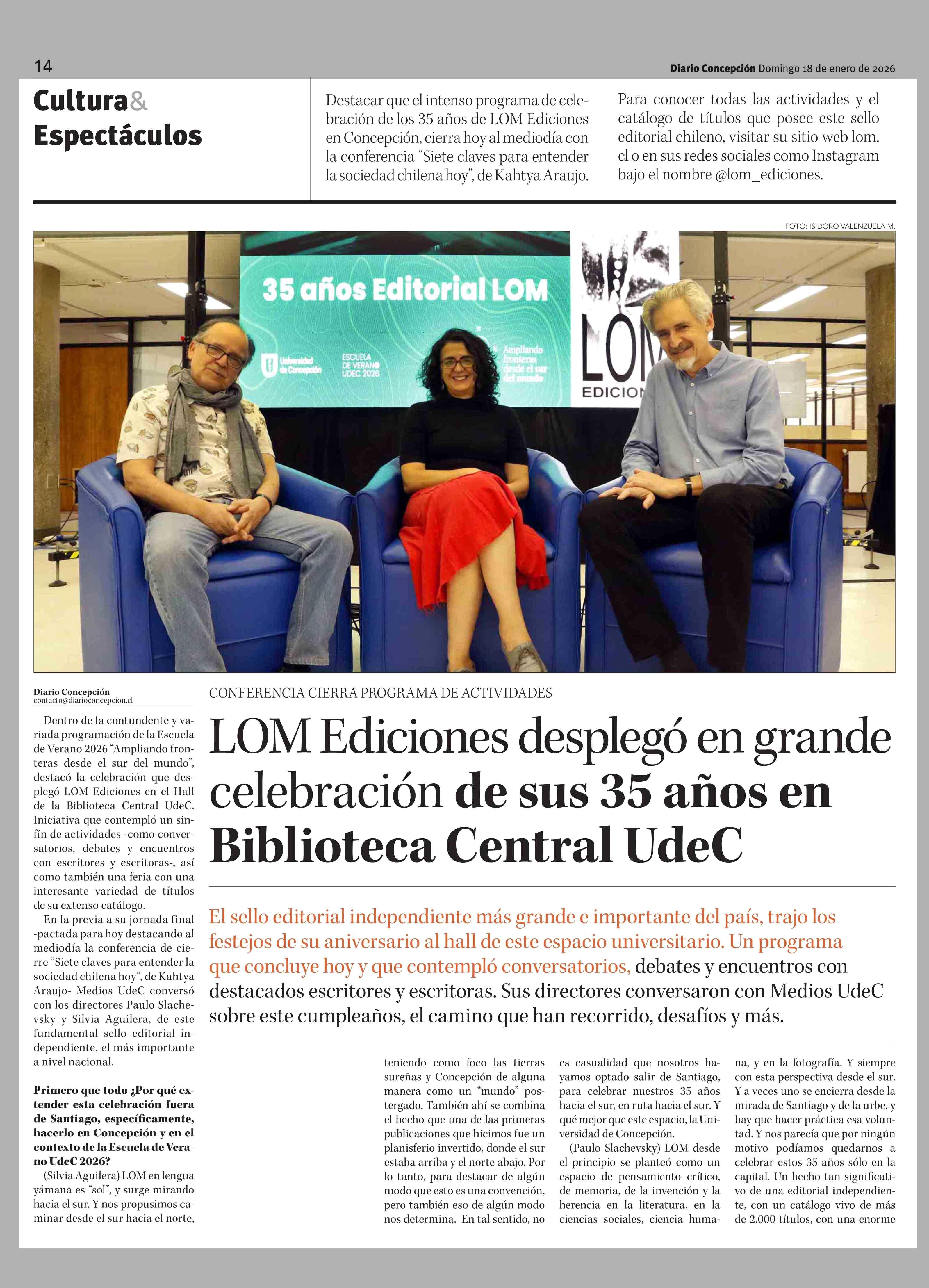 LOM Ediciones desplegó en grande celebración de sus 35 años en Biblioteca Central UdeC 18-01-2026 Diario Concepción |