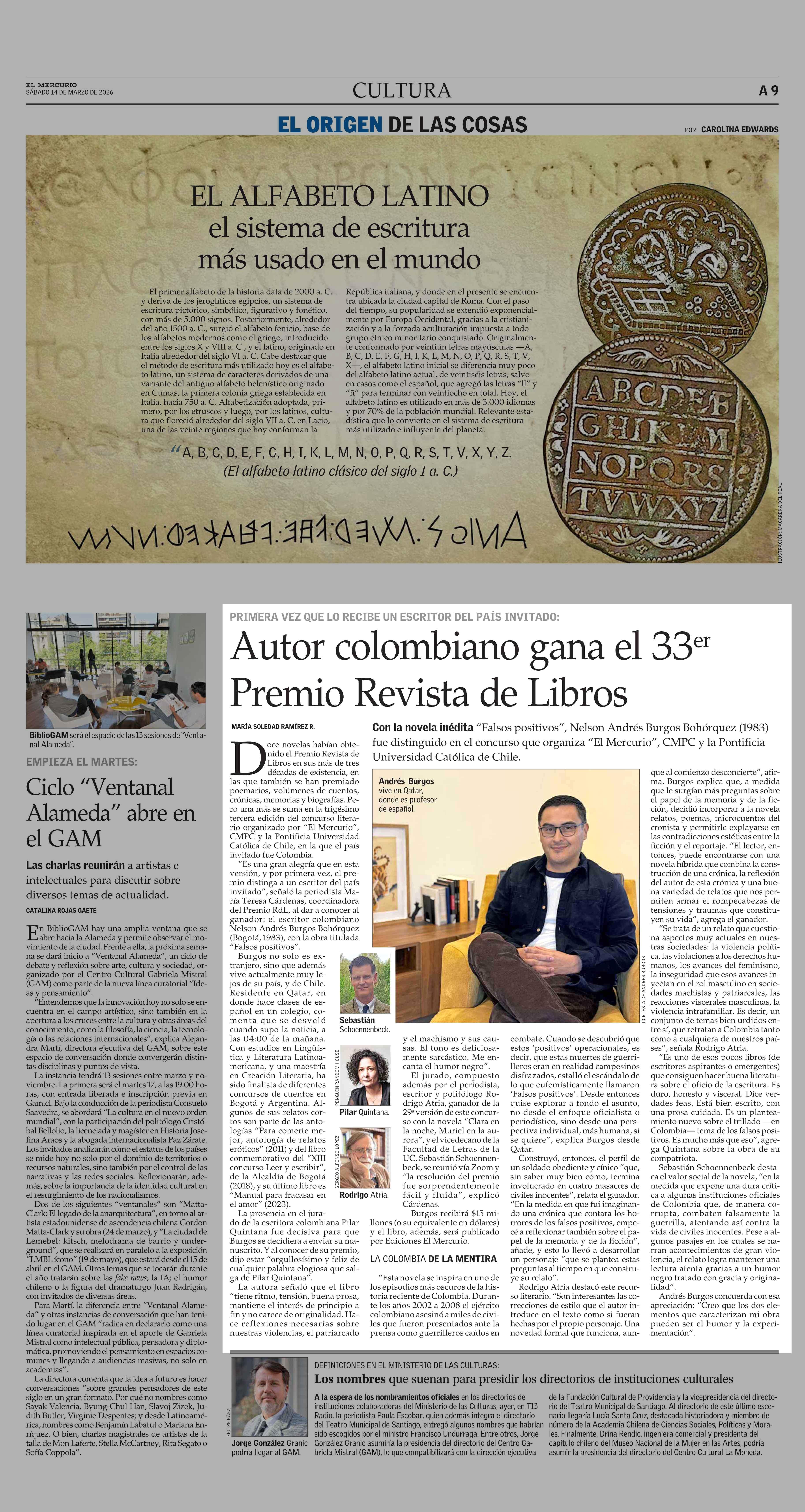 Autor colombiano gana el 33er Premio Revista de Libros 14-03-2026 El Mercurio |