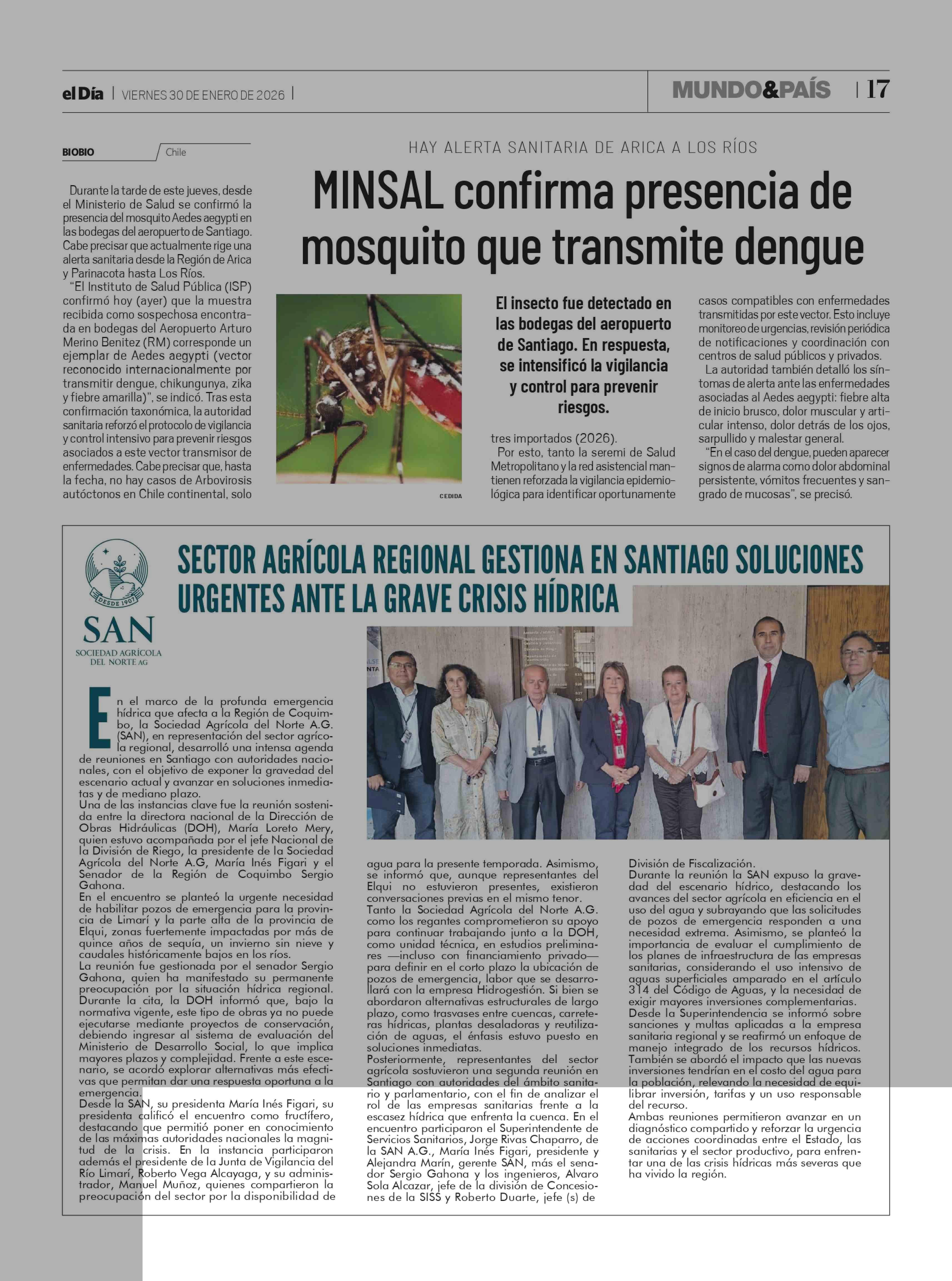SECTOR AGRÍCOLA REGIONAL GESTIONA EN SANTIAGO SOLUCIONES URGENTES ANTE LA GRAVE CRISIS HÍDRICA 30-01-2026 El Día |