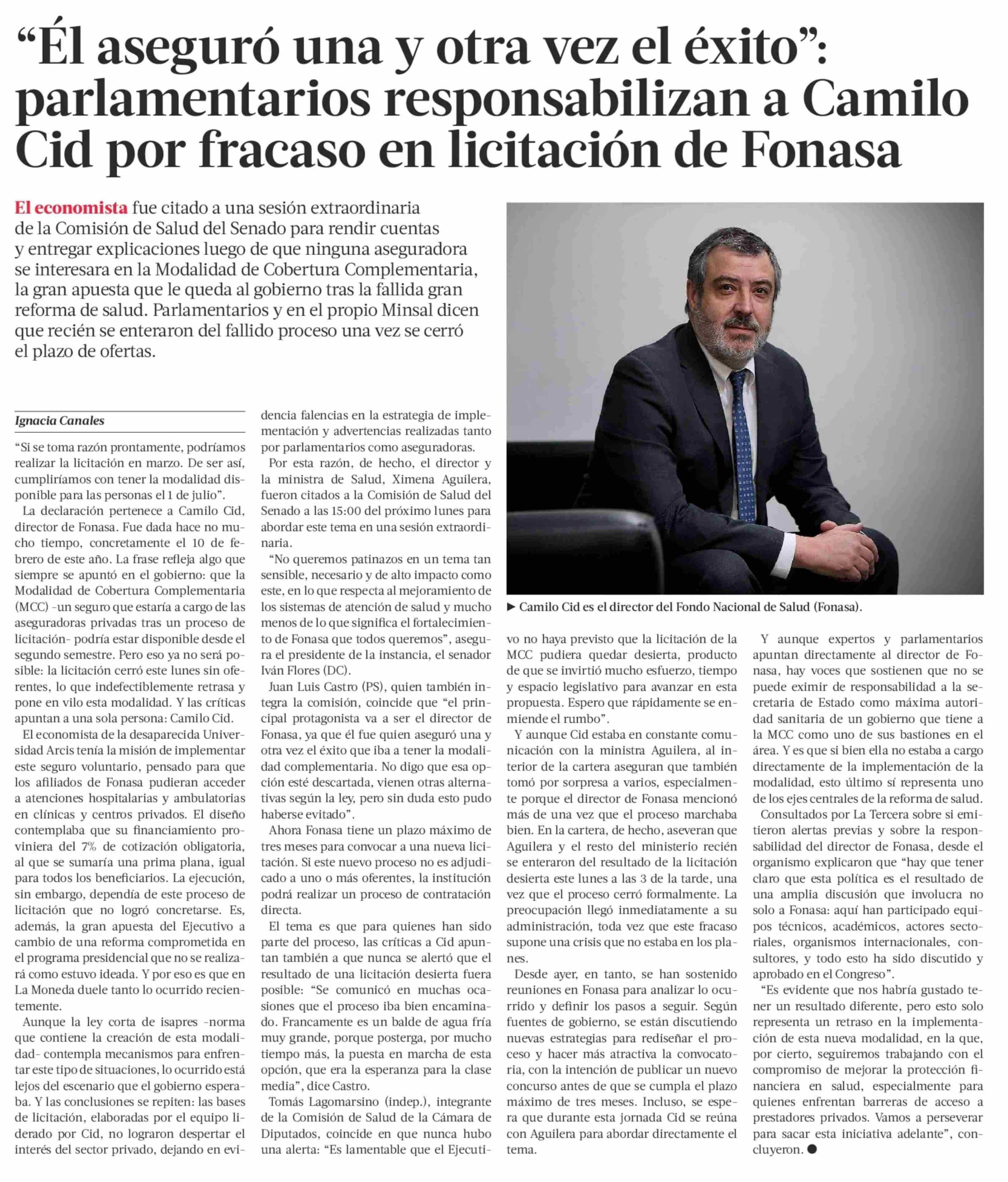 "Él aseguró una y otra vez el éxito": parlamentarios responsabilizan a Camilo Cid por fracaso en licitación de Fonasa 25-06-2025 La Tercera |