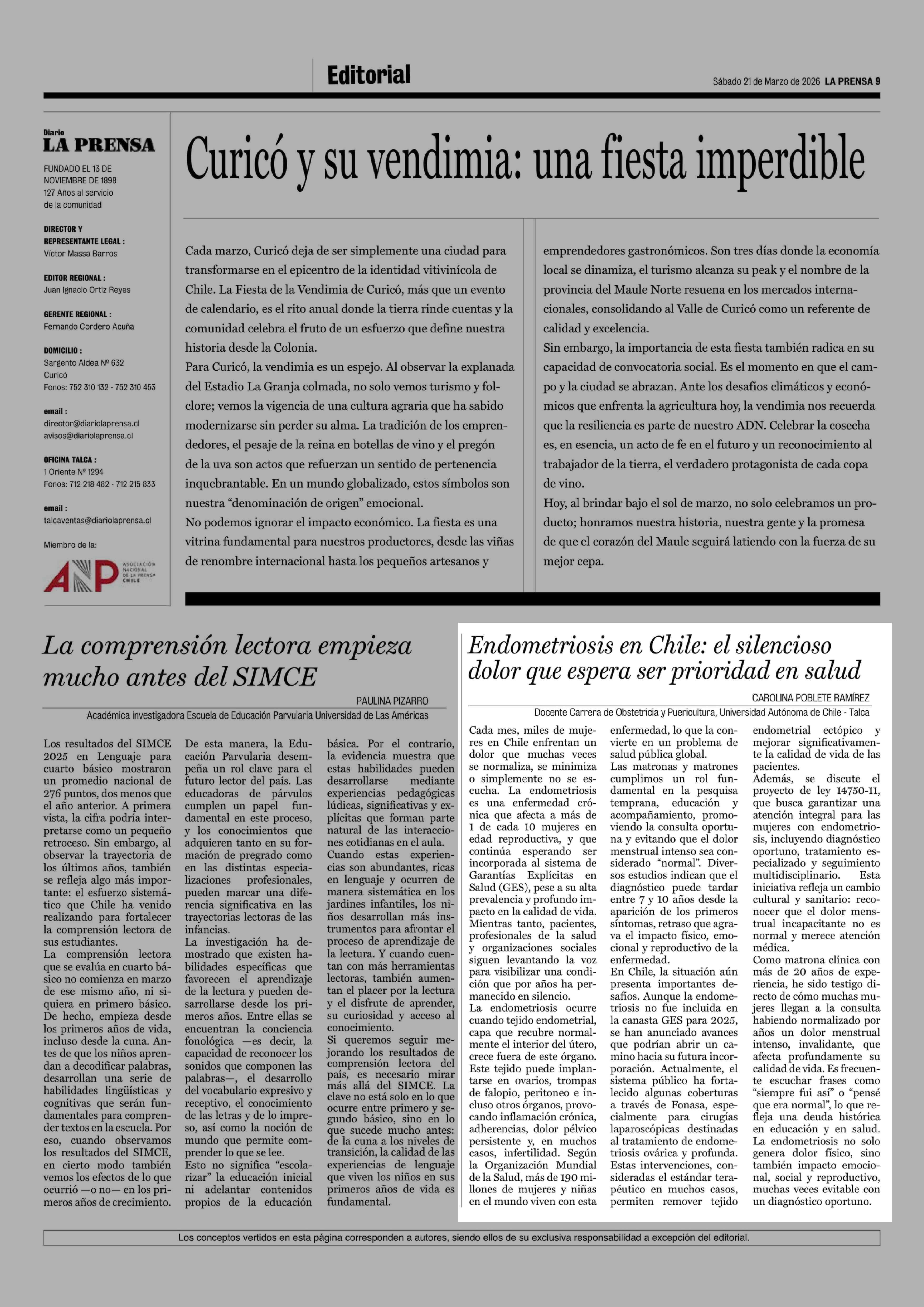 Cartas: Endometriosis en Chile: el silencioso dolor que espera ser prioridad en salud 21-03-2026 La Prensa de Curicó |