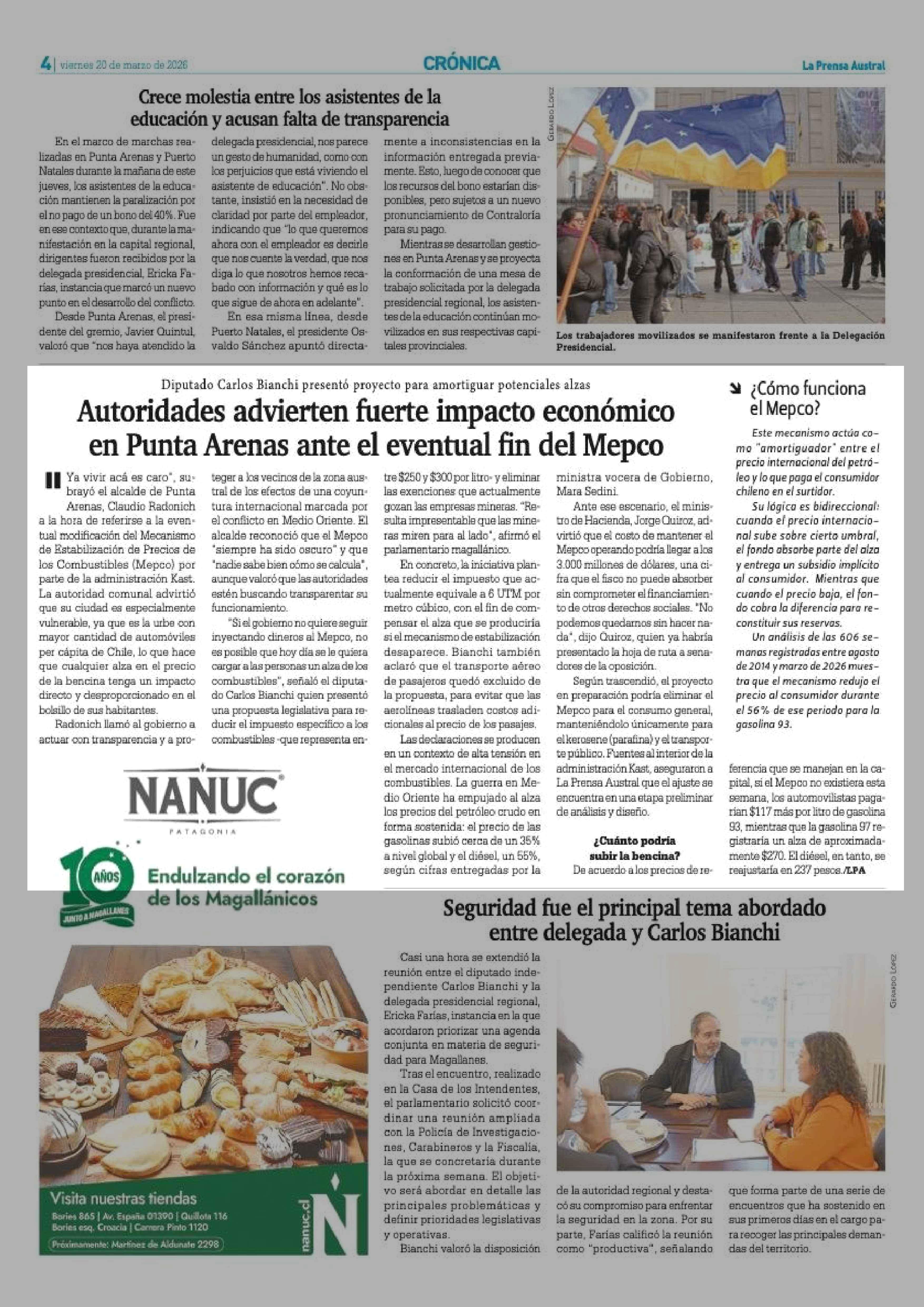 Autoridades advierten fuerte impacto económico en Punta Arenas ante el eventual fin del Mepco 20-03-2026 La Prensa Austral |