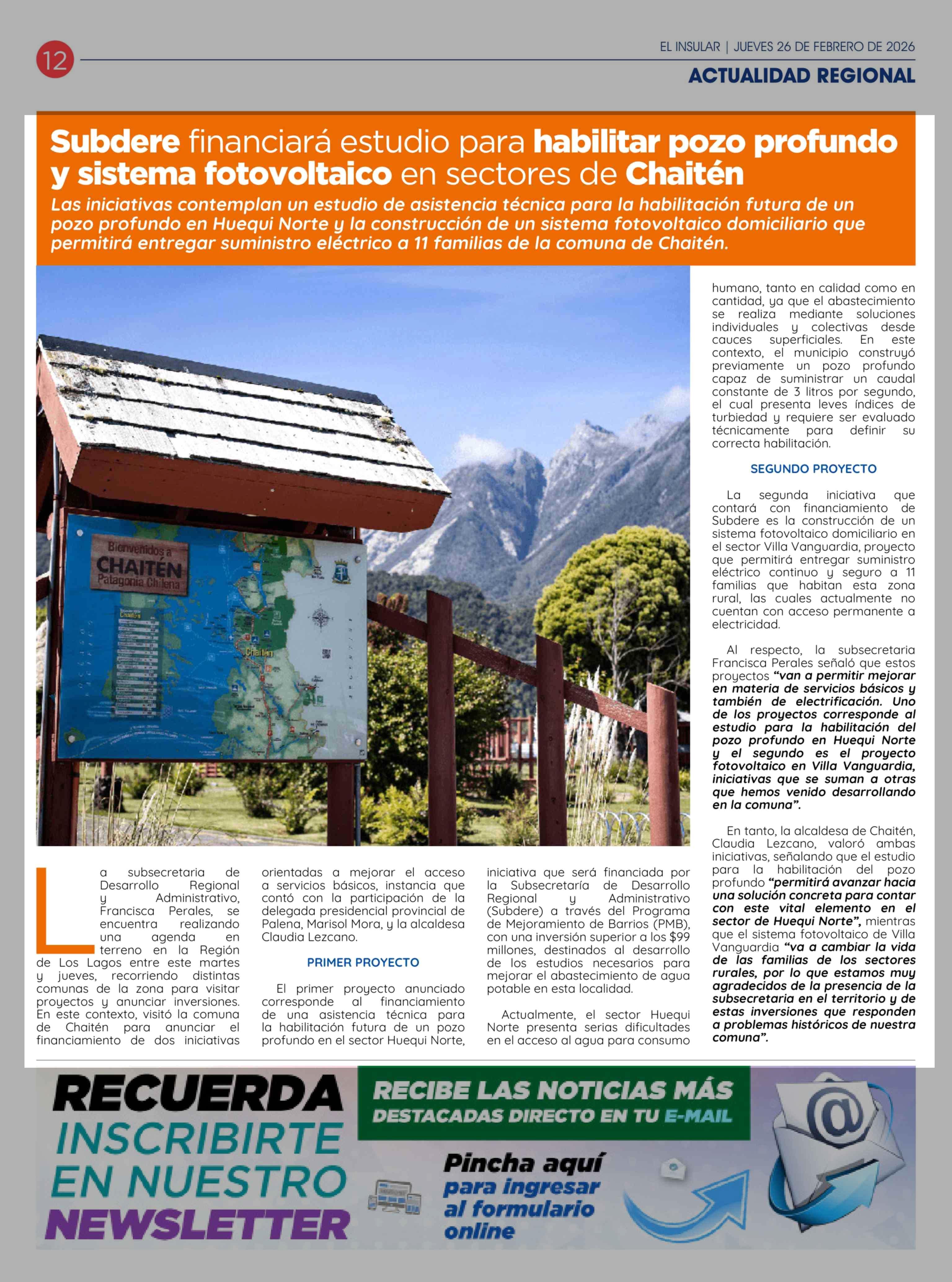 Subdere financiará estudio para habilitar pozo profundo y sistema fotovoltaico en sectores de Chaitén 26-02-2026 El Insular |