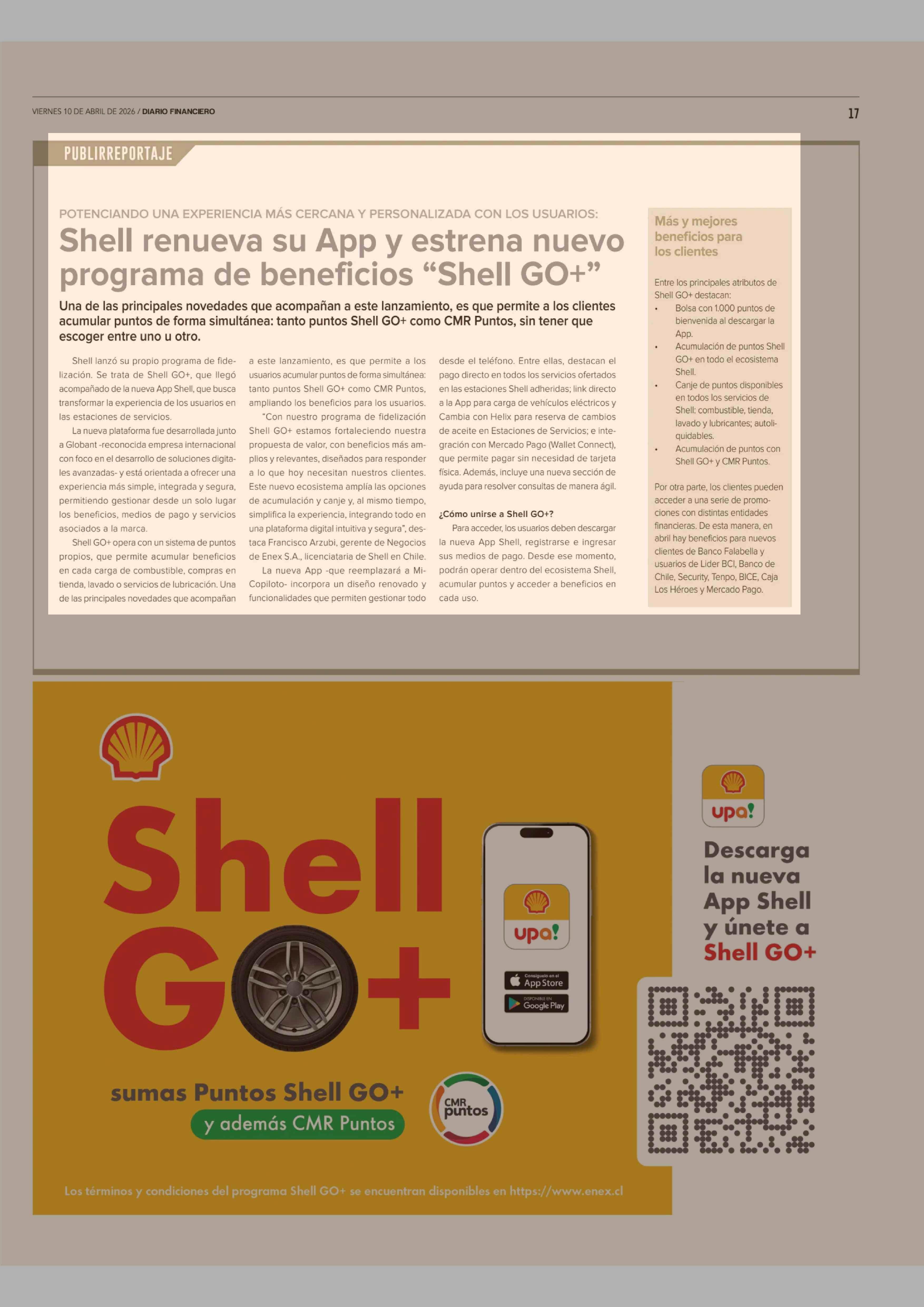 Shell renueva su App y estrena nuevo programa de beneficios "Shell GO+" 10-04-2026 Diario Financiero |