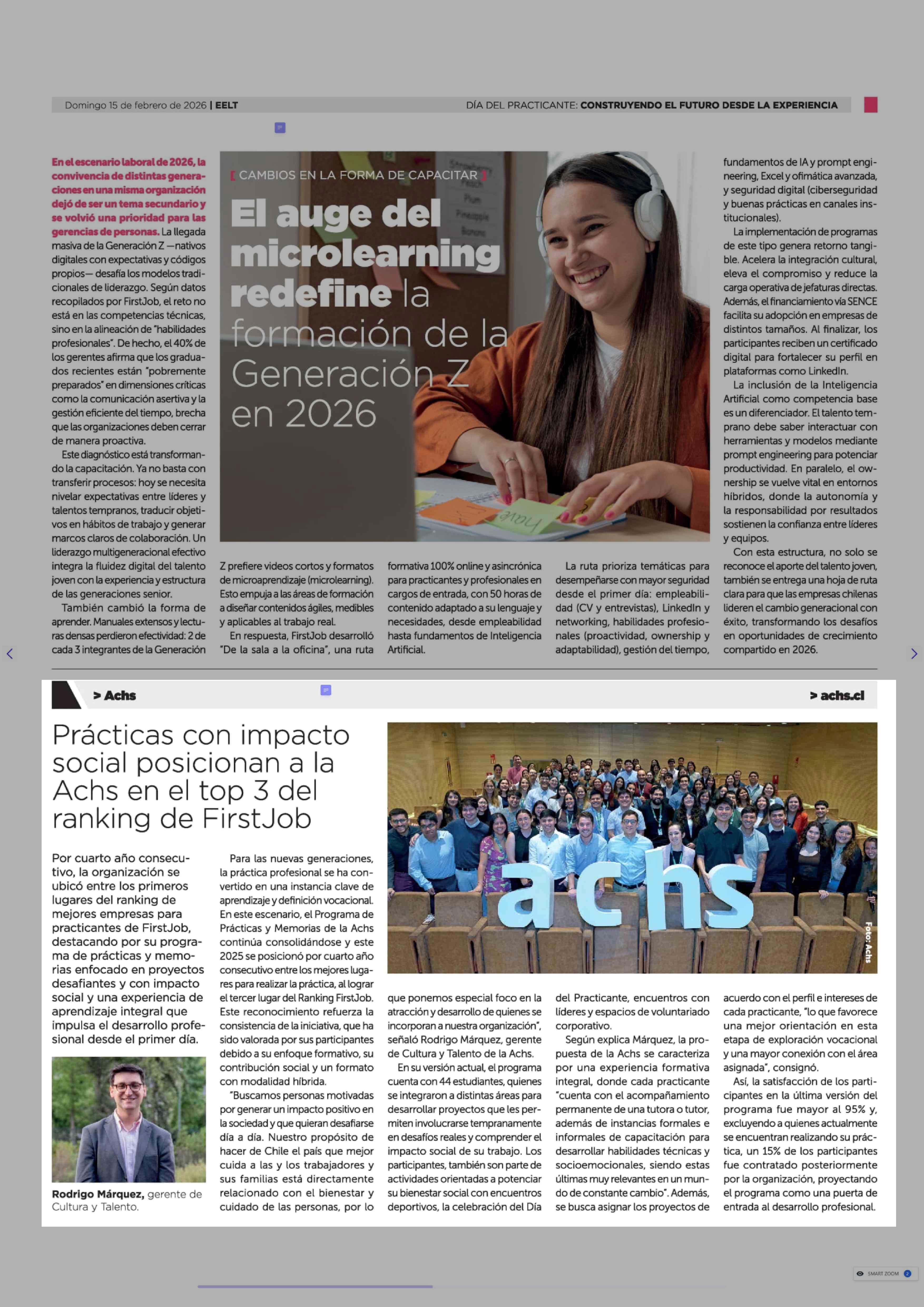 Prácticas con impacto social posicionan a la Achs en el top 3 del ranking de FirstJob 15-02-2026 La Tercera |