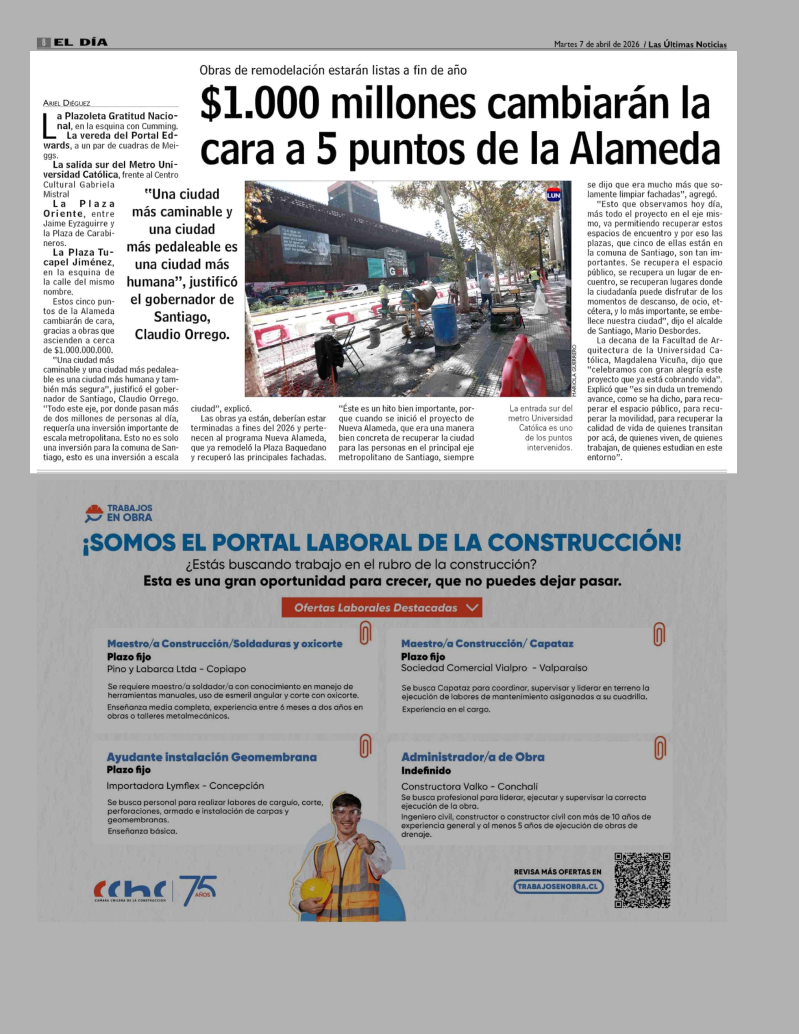 $1.000 Millones cambiarán la cara a 5 puntos de la Alameda 07-04-2026 Las Últimas Noticias |