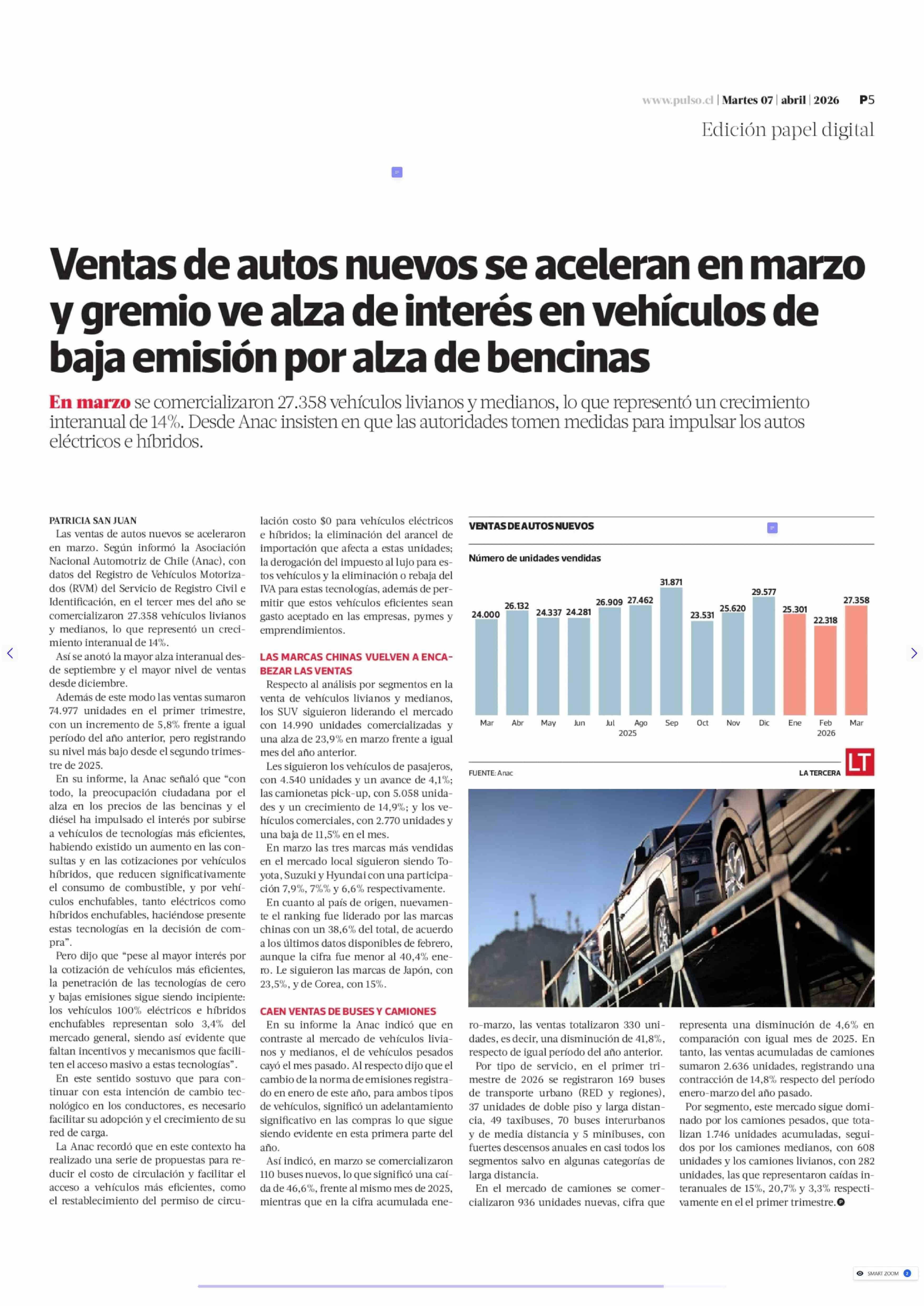 Ventas de autos nuevos se aceleran en marzo y gremio ve alza de interés en vehículos de baja emisión por alza de bencinas 07-04-2026 La Tercera |