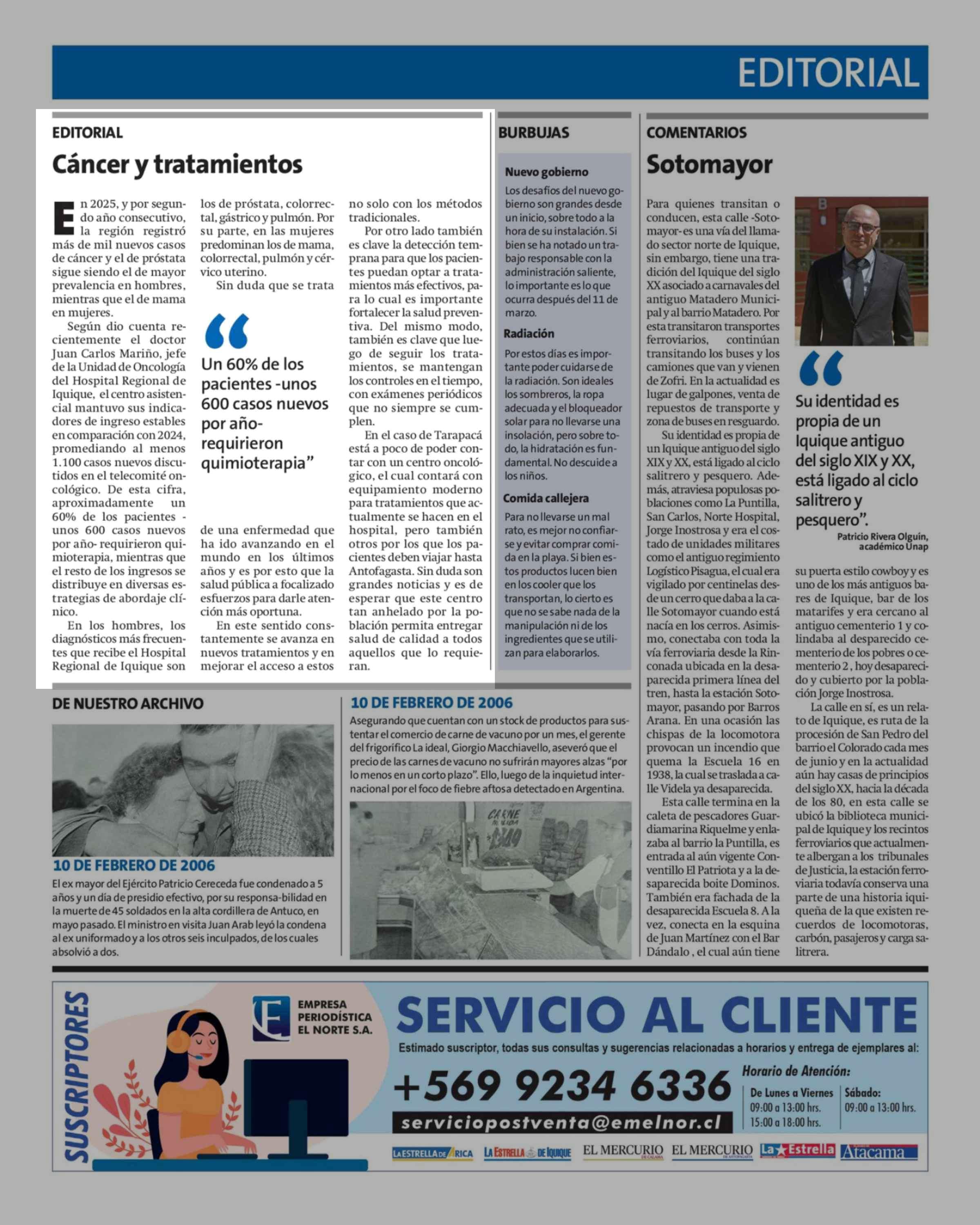 Editorial: Cáncer y tratamientos 10-02-2026 La Estrella de Iquique |