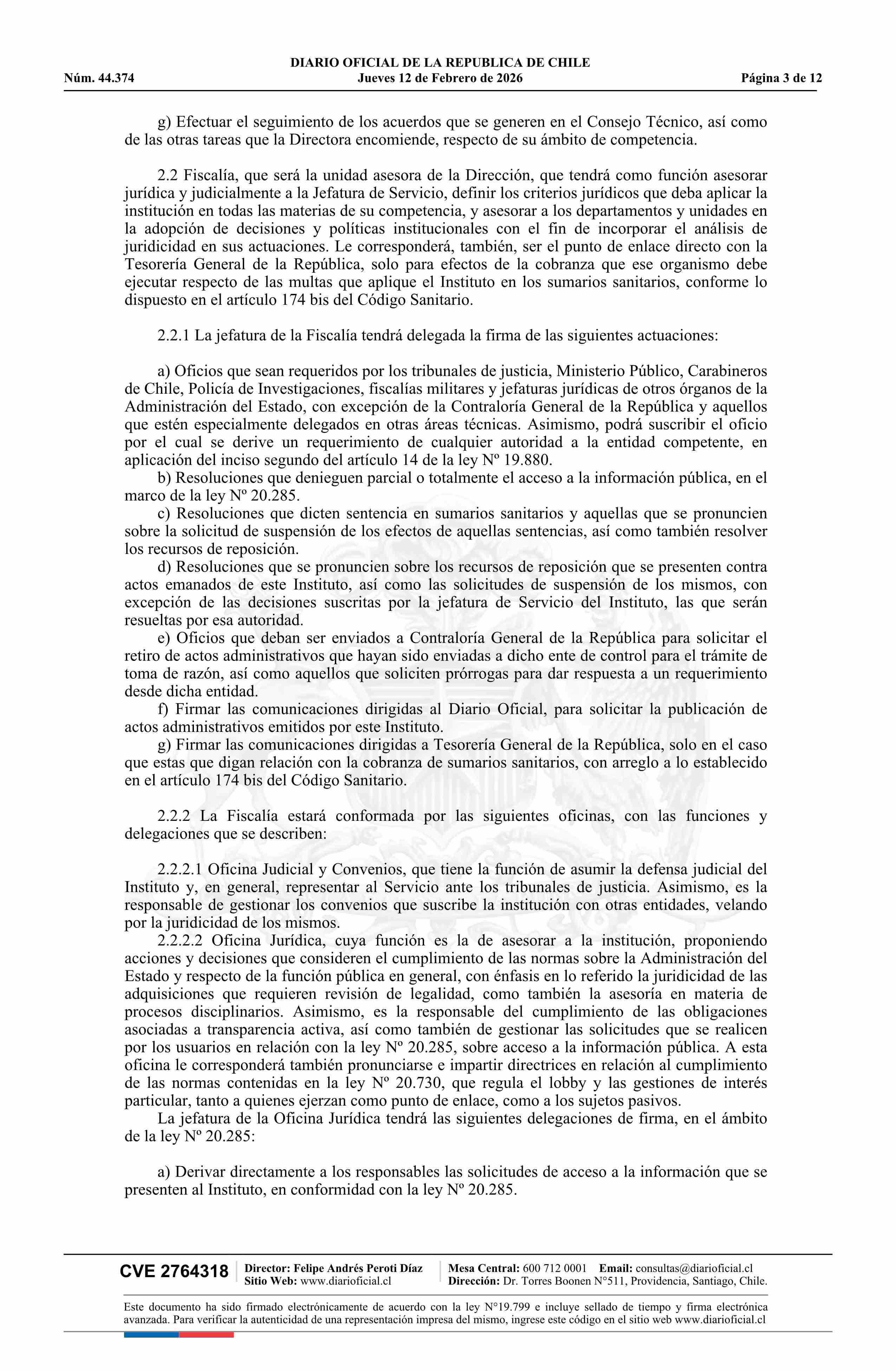 | Título: | Resolución exenta número E562, de 2026.- Modifica la resolución Nº 191 exenta, de 2021, que establece la estructura orgánica, funciones y delegación de firma y facultades de las distintas dependencias del Instituto de Salud Pública de Chile |