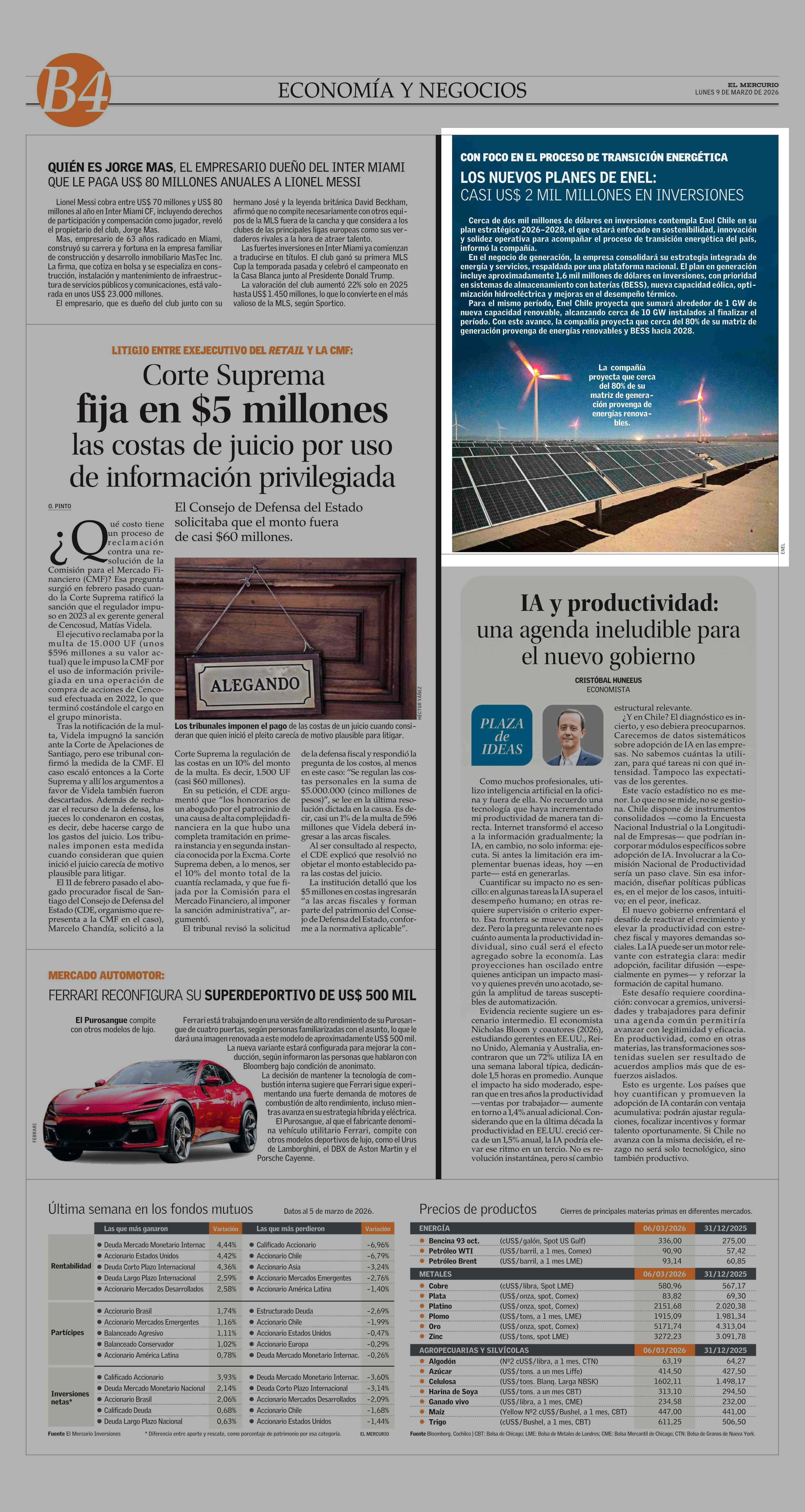 LOS NUEVOS PLANES DE ENEL: CASI US$ 2 MIL MILLONES EN INVERSIONES 09-03-2026 El Mercurio |