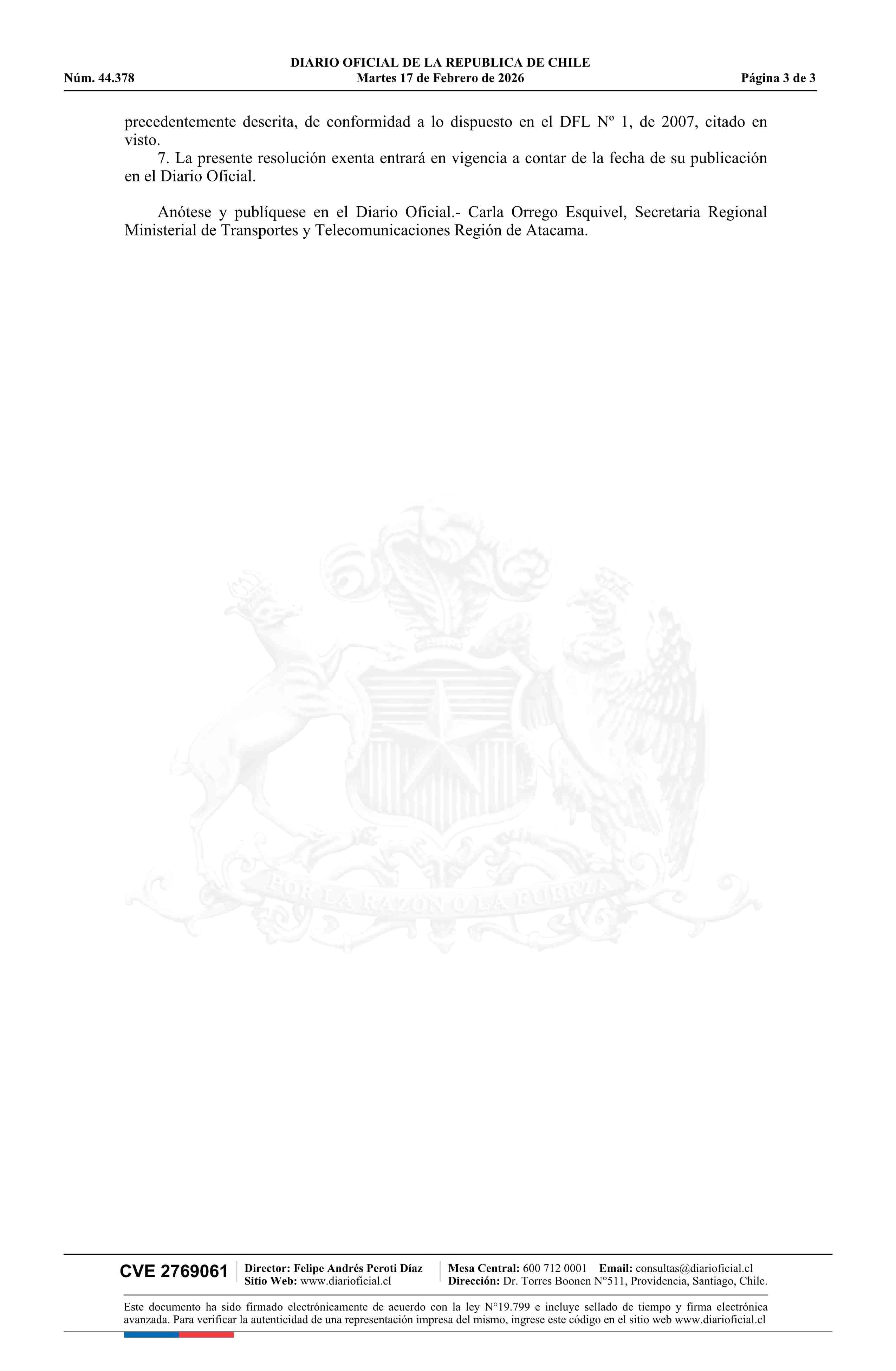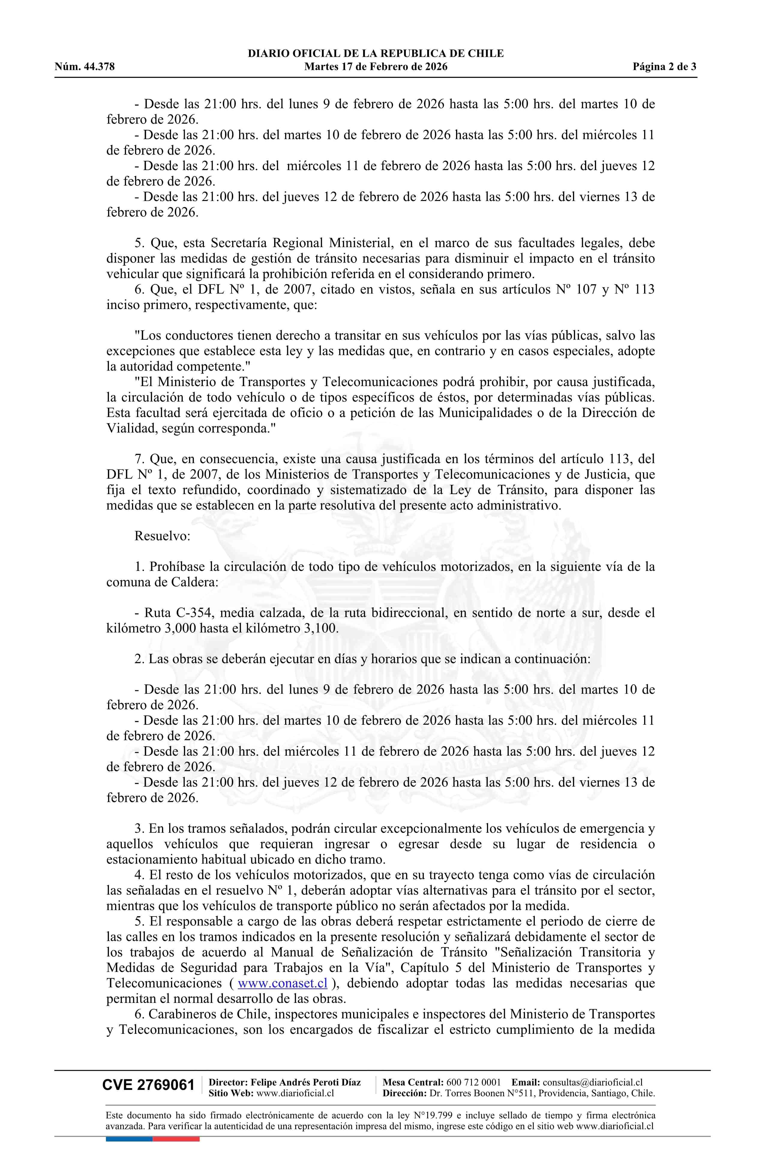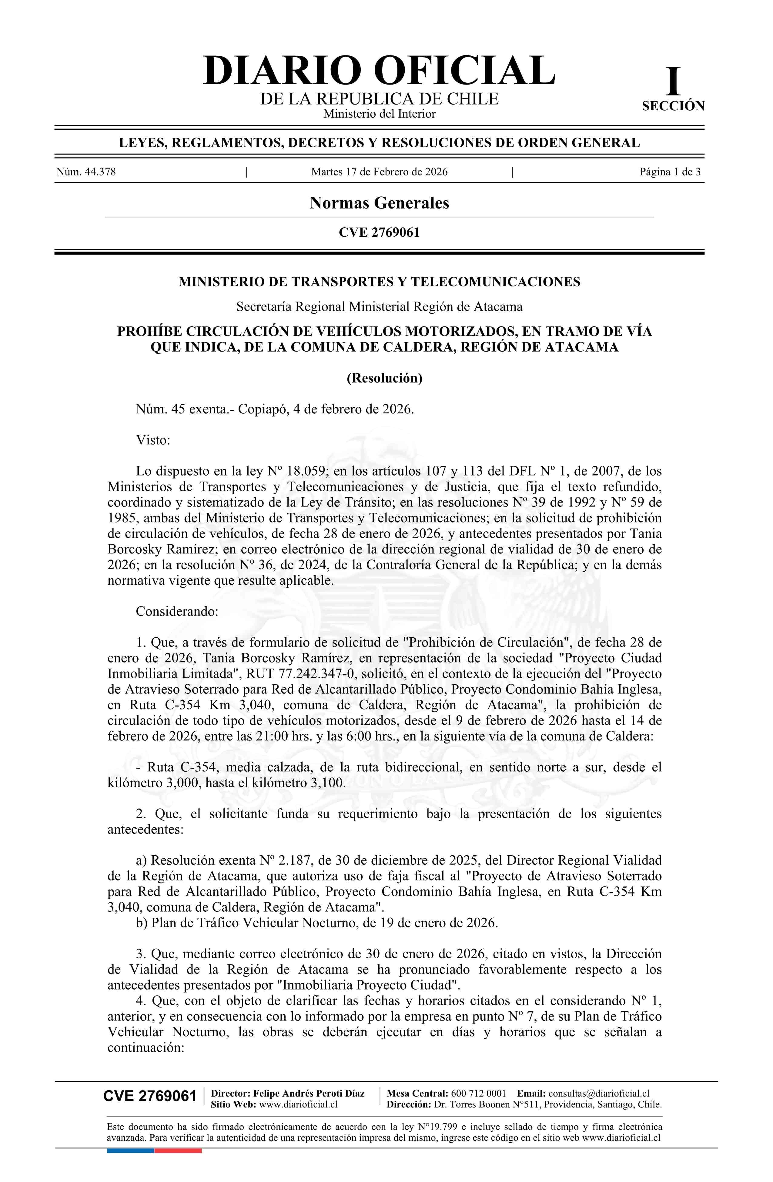 Resolución exenta número 45, de 2026.- Prohíbe circulación de vehículos motorizados, en tramo de vía que indica, de la comuna de Caldera 17-02-2026 Diario Oficial Edición Electrónica |