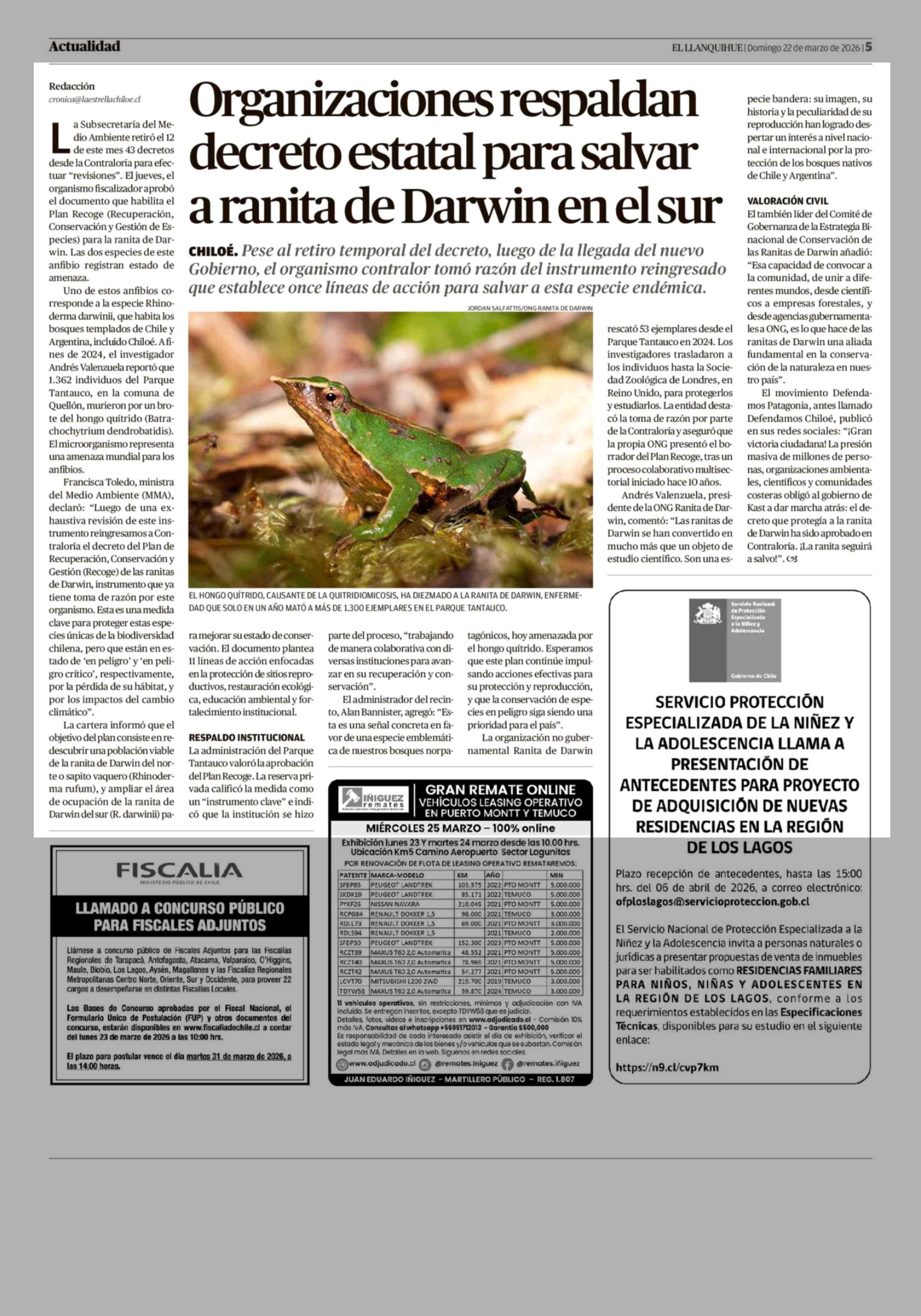 Organizaciones respaldan decreto estatal para salvar a ranita de Darwin en el sur 22-03-2026 El Llanquihue |