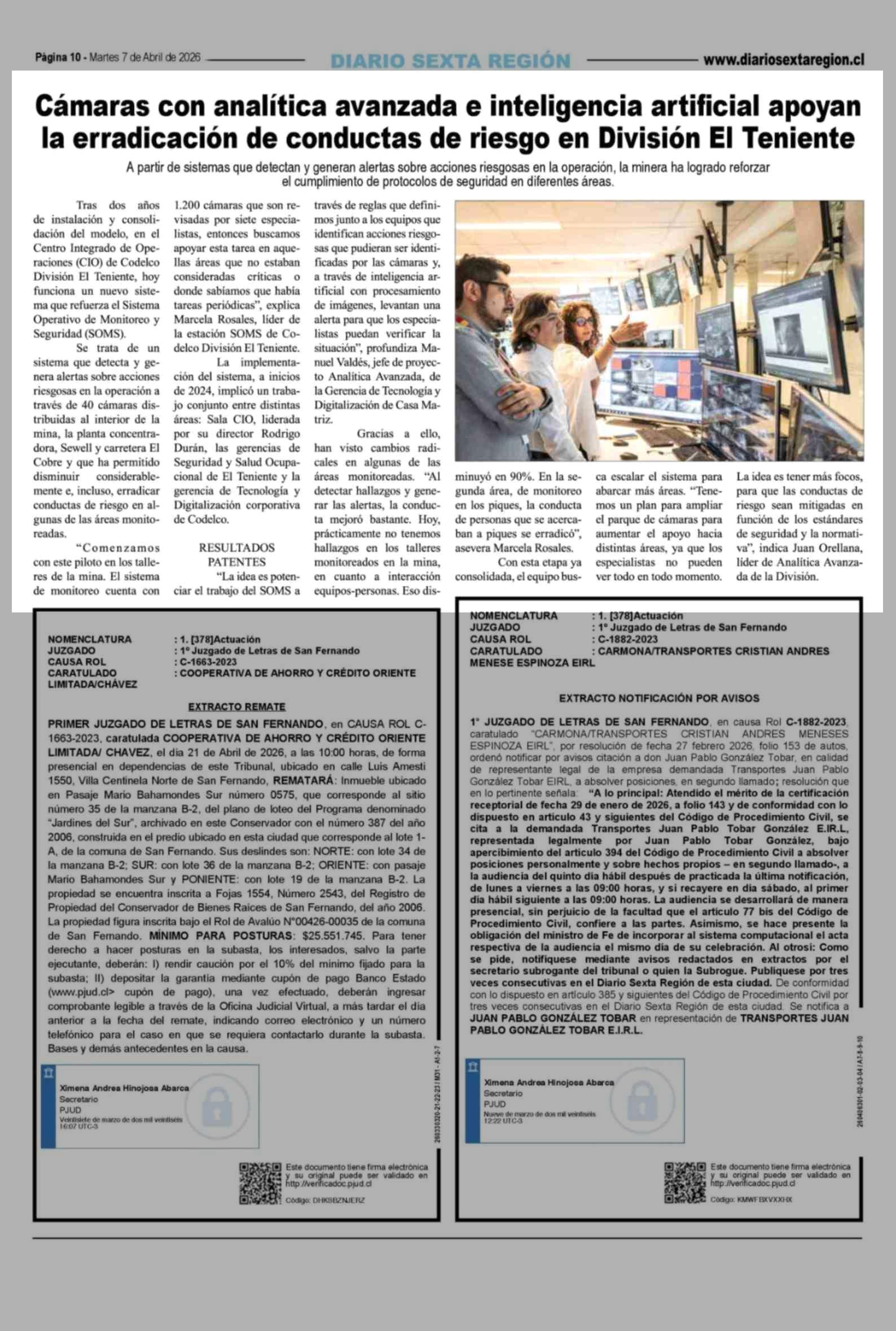 Cámaras con analítica avanzada e inteligencia artificial apoyan la erradicación de conductas de riesgo en División El Teniente 07-04-2026 Diario VI Región |