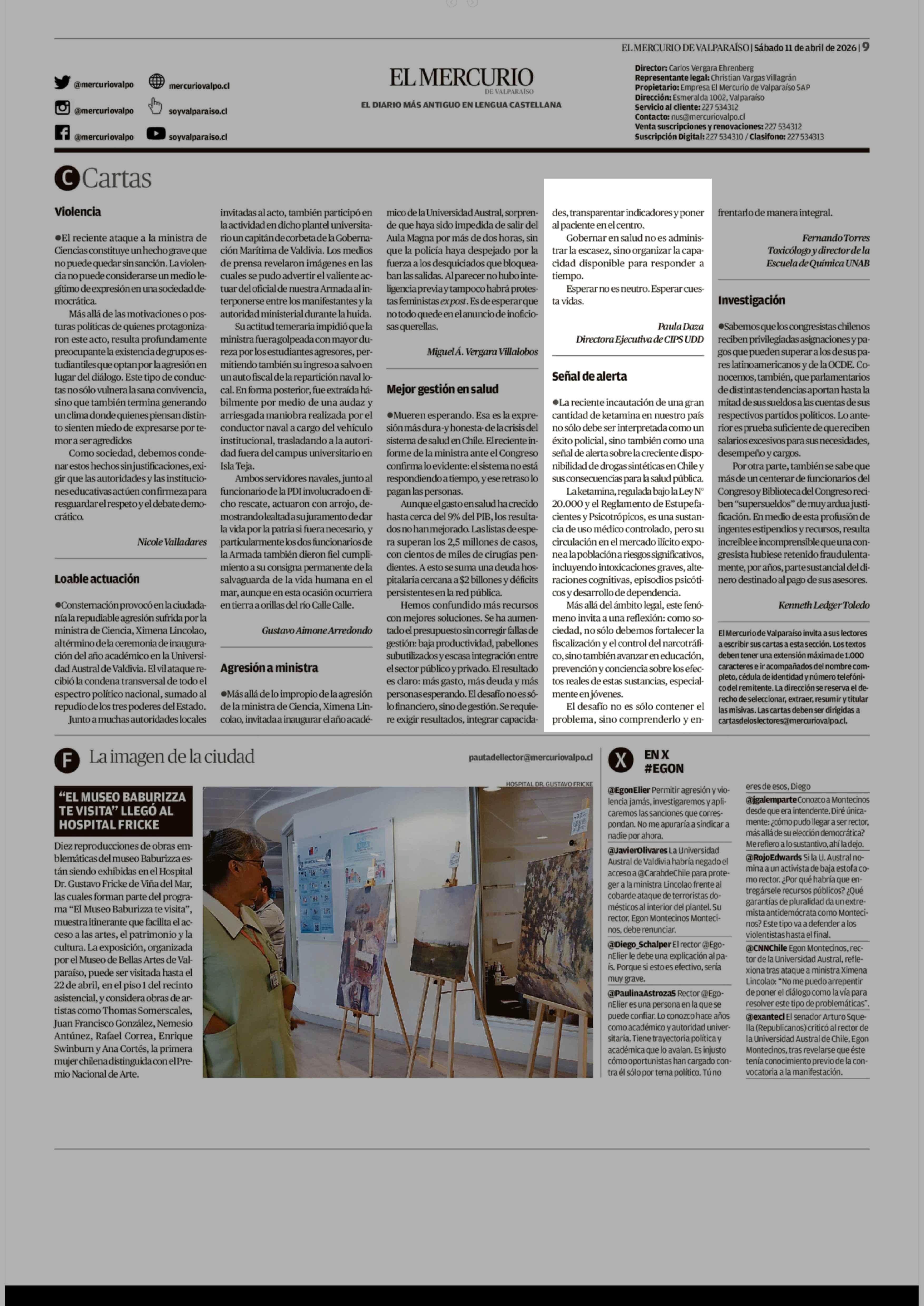 CARTAS: Mejor gestión en salud 11-04-2026 El Mercurio de Valparaíso |