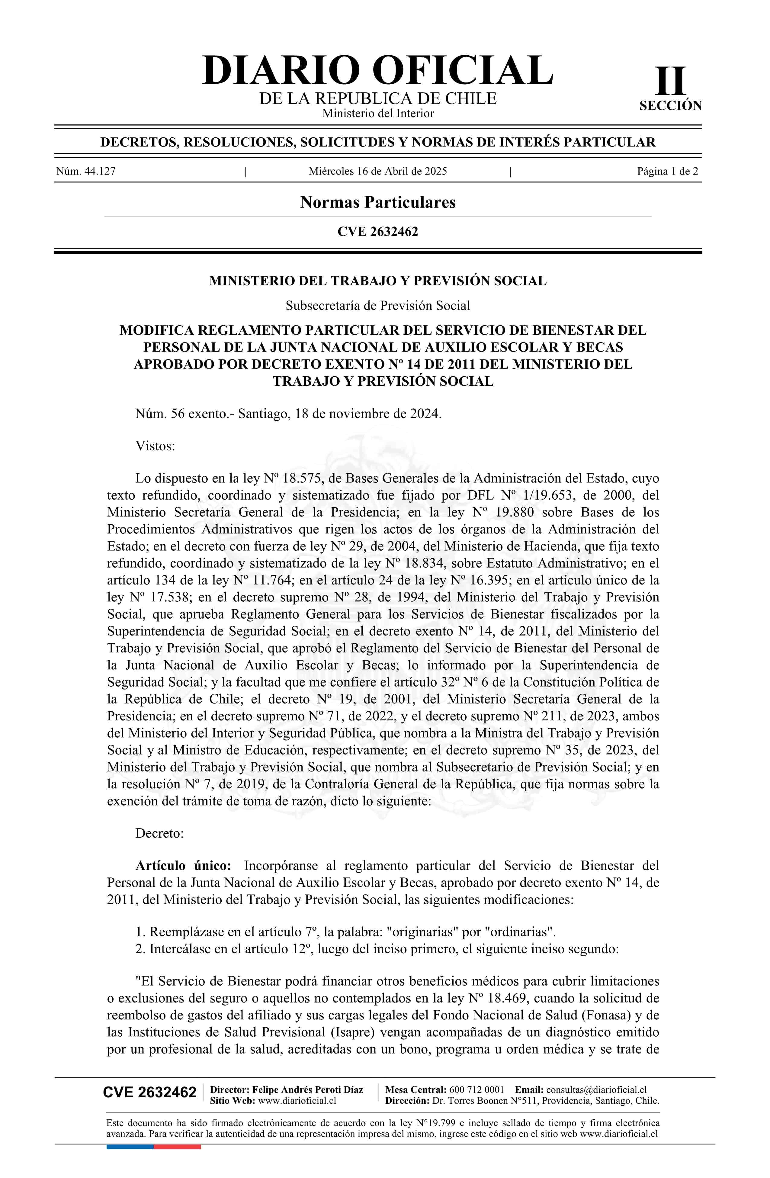| Título: | Decreto exento número 56, de 2024.- Modifica reglamento particular del Servicio de Bienestar del Personal de la Junta Nacional de Auxilio Escolar y Becas aprobado por decreto exento Nº 14, de 2011 |
