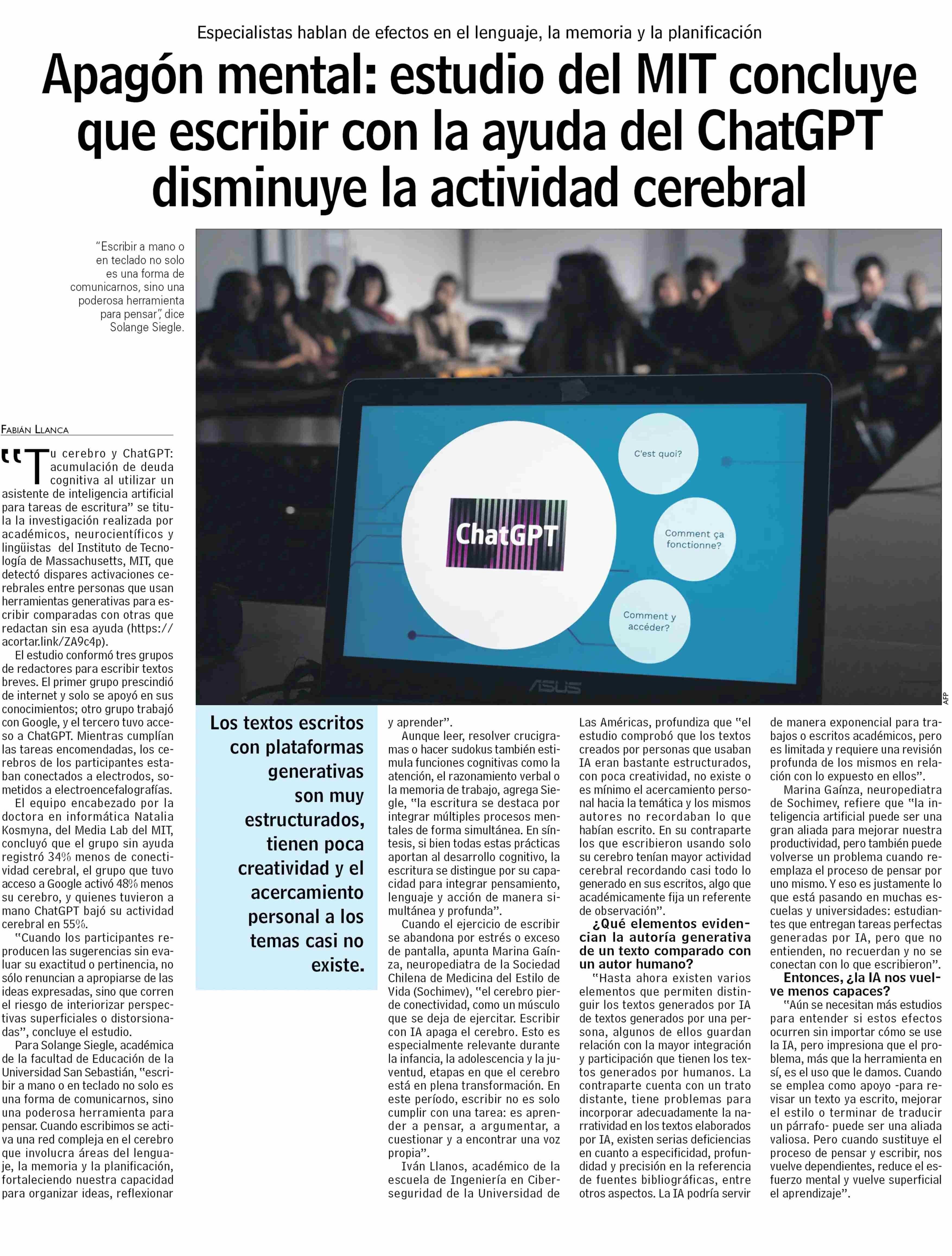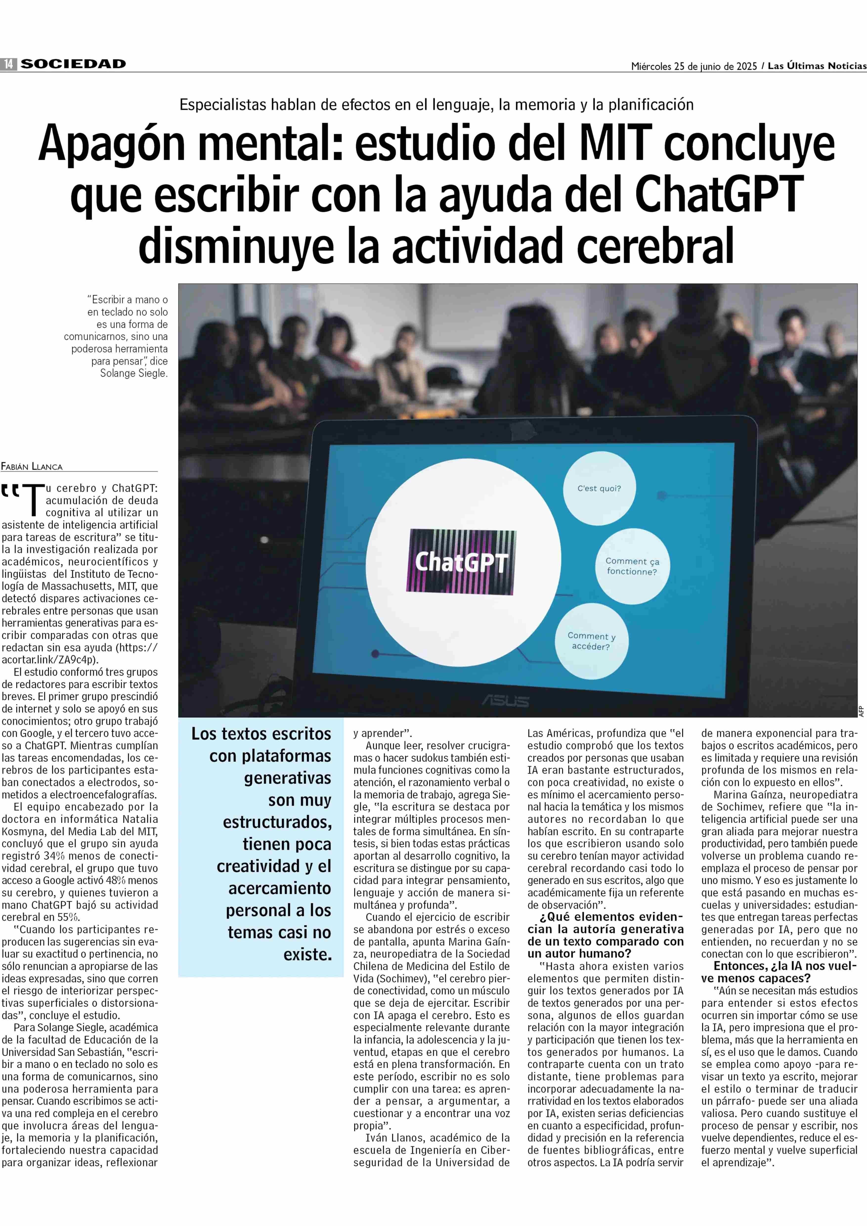 Apagón mental: estudio del MIT concluye que escribir con la ayuda del ChatGPT disminuye la actividad cerebral 25-06-2025 Las Últimas Noticias |