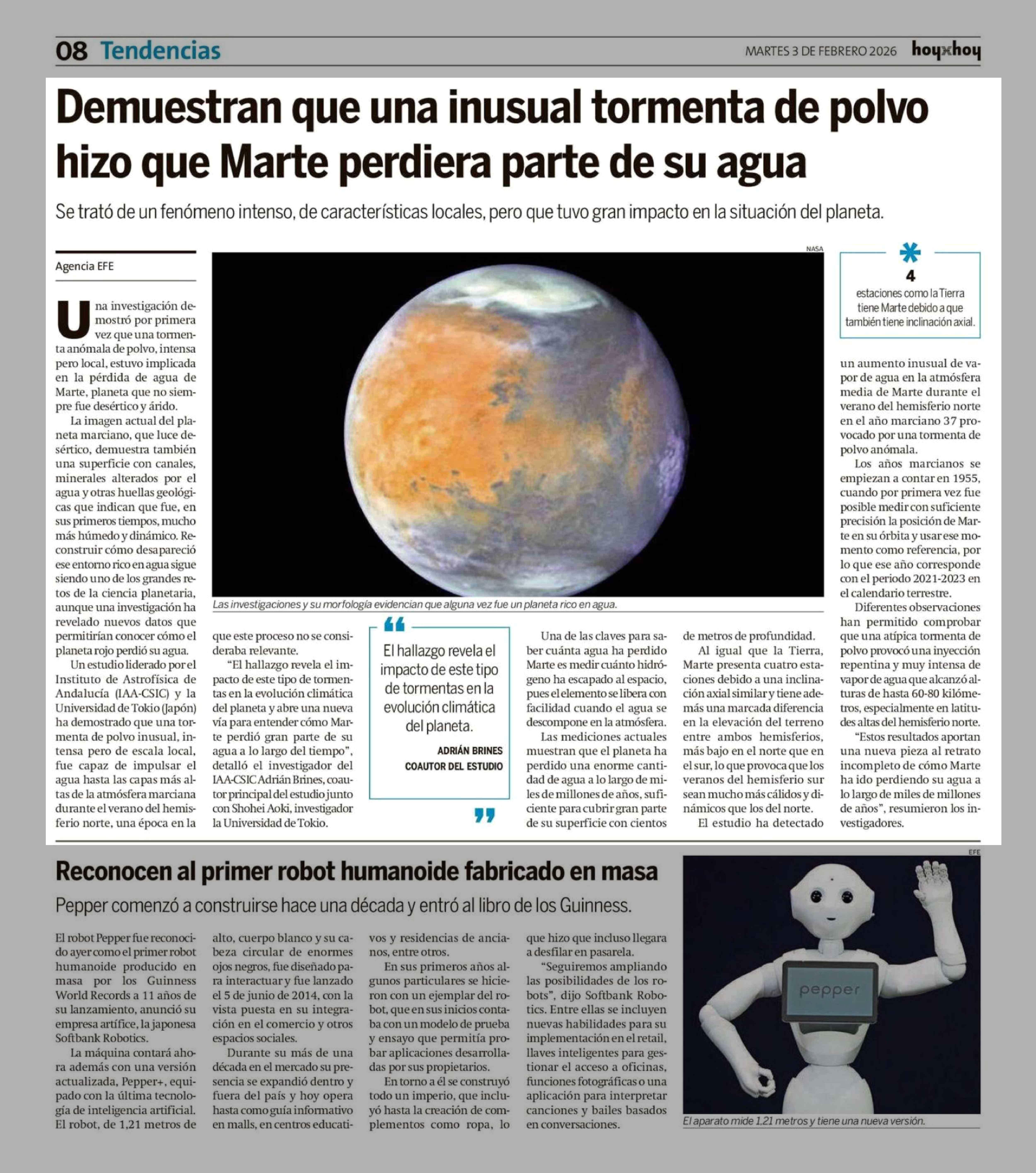 Título: Demuestran que una inusual tormenta de polvo hizo que Marte perdiera parte de su agua