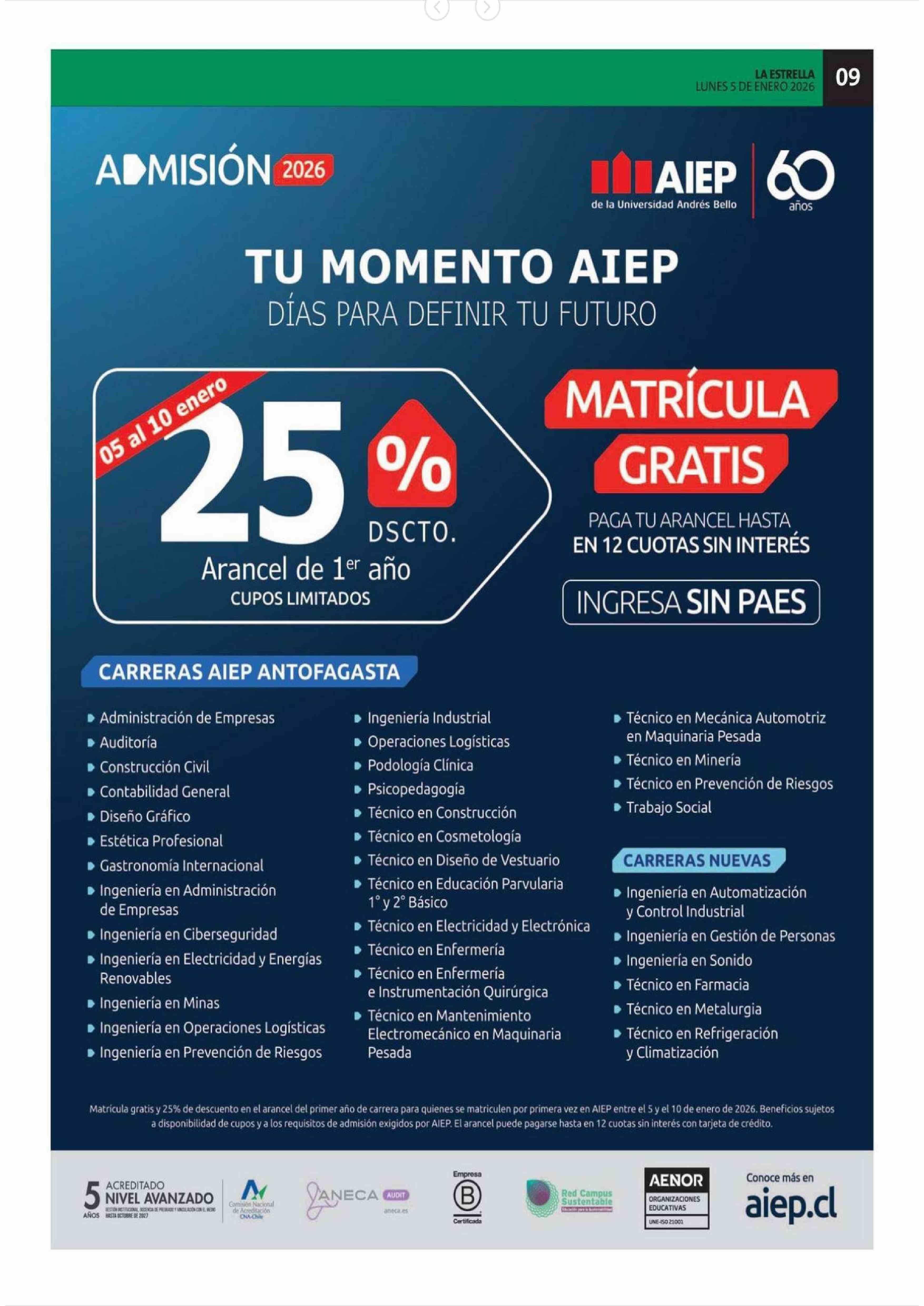 Aviso Educación: AIEP 05-01-2026 La Estrella de Antofagasta |