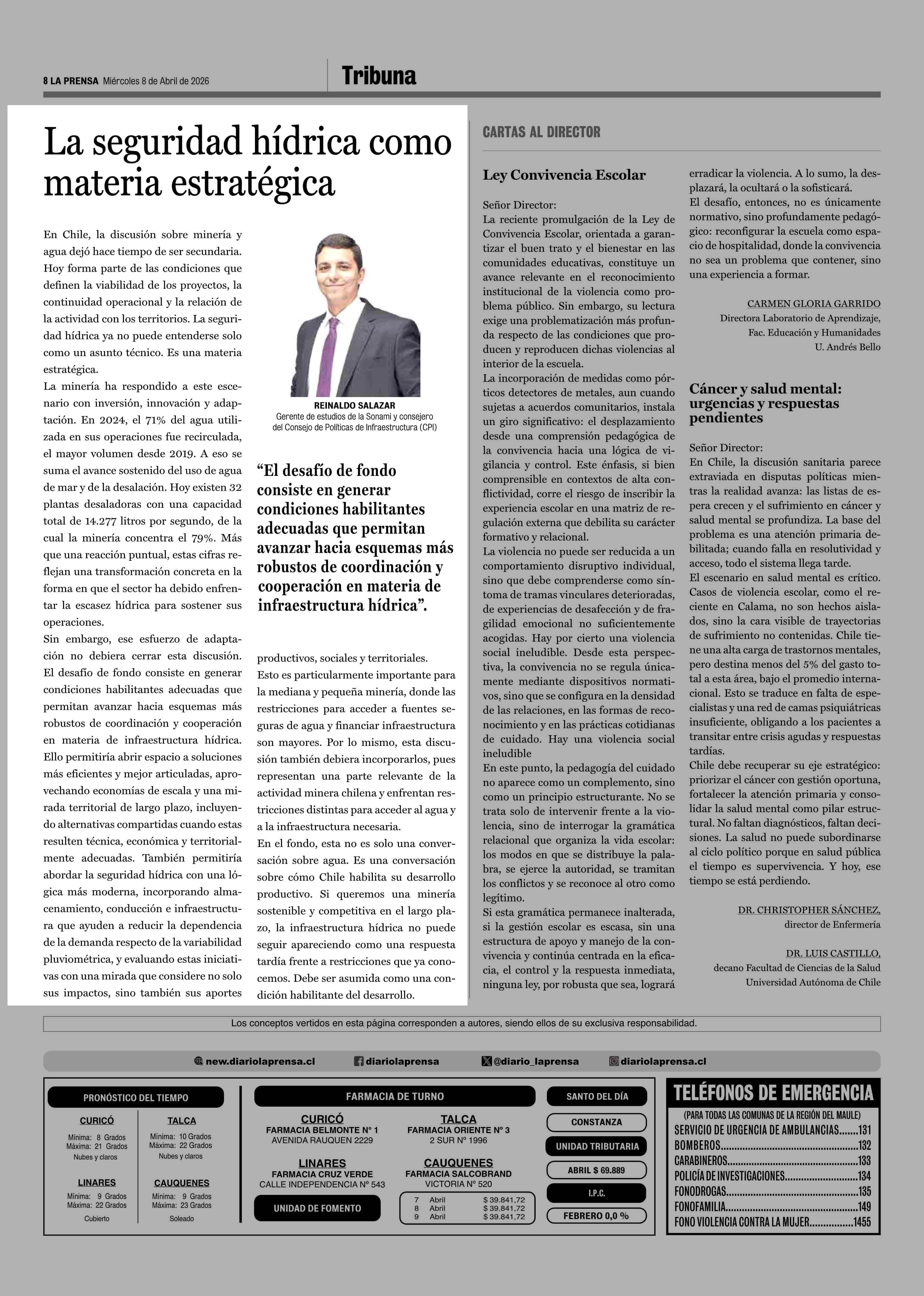 COLUMNAS DE OPINIÓN: La seguridad hídrica como La seguridad hídrica como materia estratégica materia estratégica 08-04-2026 La Prensa de Curicó |
