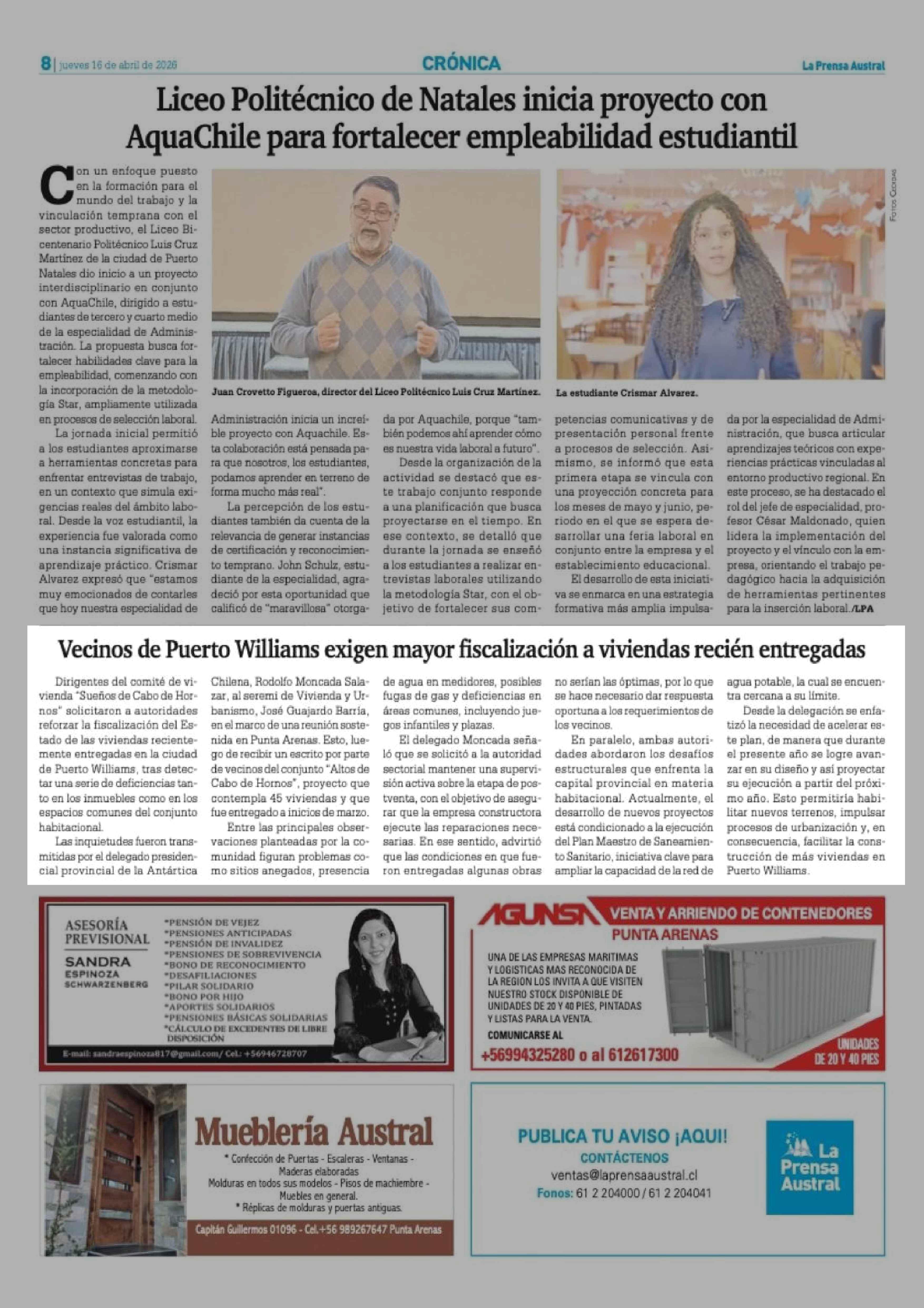 | Fecha: | 16-04-2026 | Sector: | Noticia general | Región: | Región de Magallanes y de la Antártica Chilena |